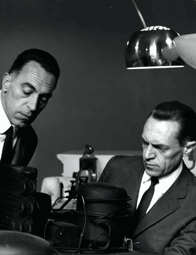 Achille et Pier Giacomo Castiglioni étaient deux frères italiens, des figures incontournables du design du XXe siècle, dont les créations ont profondément influencé le développement du design industriel et de l'architecture moderne. Les frères Castiglioni ont travaillé ensemble pendant de nombreuses années, créant des objets qui alliaient fonctionnalité, esthétique et innovation technique. Leur approche du design était marquée par une grande simplicité, une recherche de solutions pratiques, mais également un sens de l'humour subtil, qui se reflétait dans leurs créations.