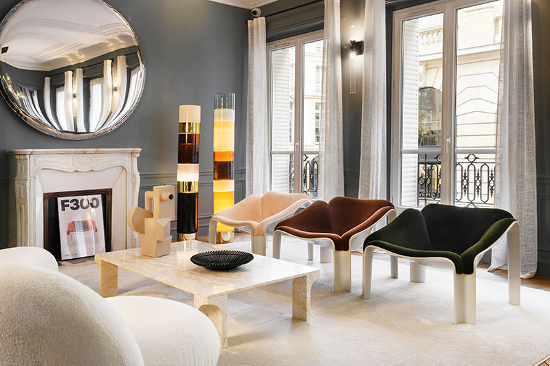 On the first floor of the Gribeauval showroom, Gubi presents the reissue of the F300 Lounge Chair, designed by Pierre Paulin. Driven by the desire to introduce or reintroduce this iconic piece of design history to a contemporary audience, Gubi took on the challenge of exploring, understanding and reinterpreting the manufacturing process originally conceived by Paulin. Gubi's reissue of the F300 Lounge Chair marks the return to production of a second masterpiece by Paulin, accompanied by its natural ally: the T877 side table. Together, these two pieces perfectly illustrate Paulin's incomparable blend of sculptural sensibility, sensitivity to materials and modernist vision.