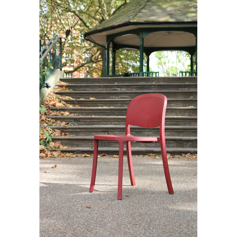 Designed by Jasper Morrison for Emeco, the 1 Inch Reclaimed chair stands out for its simple shape, the refined uniformity of a single material, perfect comfort and understated grace. Made from 90% industrial waste, including 75% polypropylene and 15% wood fibre, 1 Inch Reclaimed elegantly combines timeless design with sustainable materials. This monobloc stackable chair is suitable for frequent use, both indoors and outdoors.