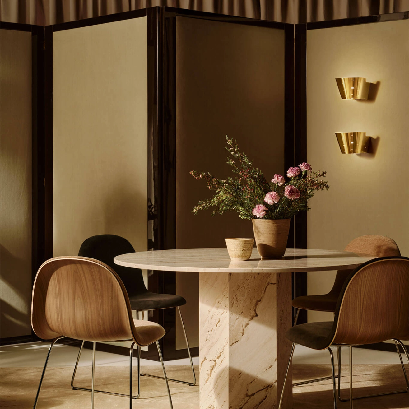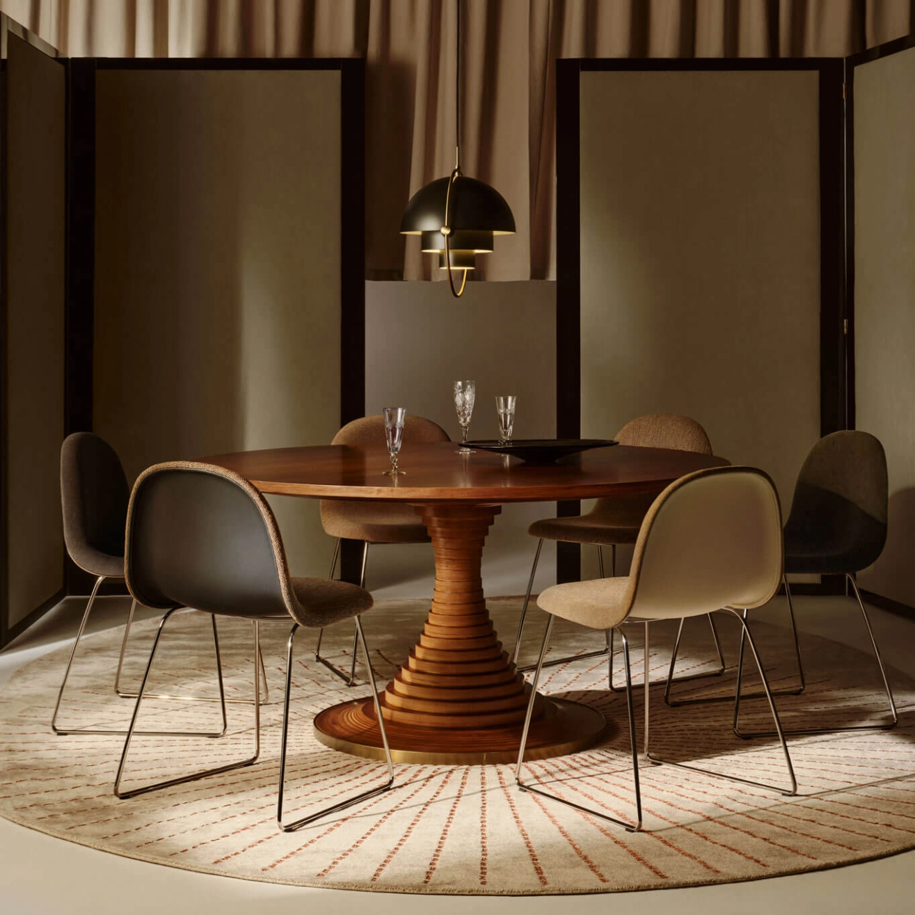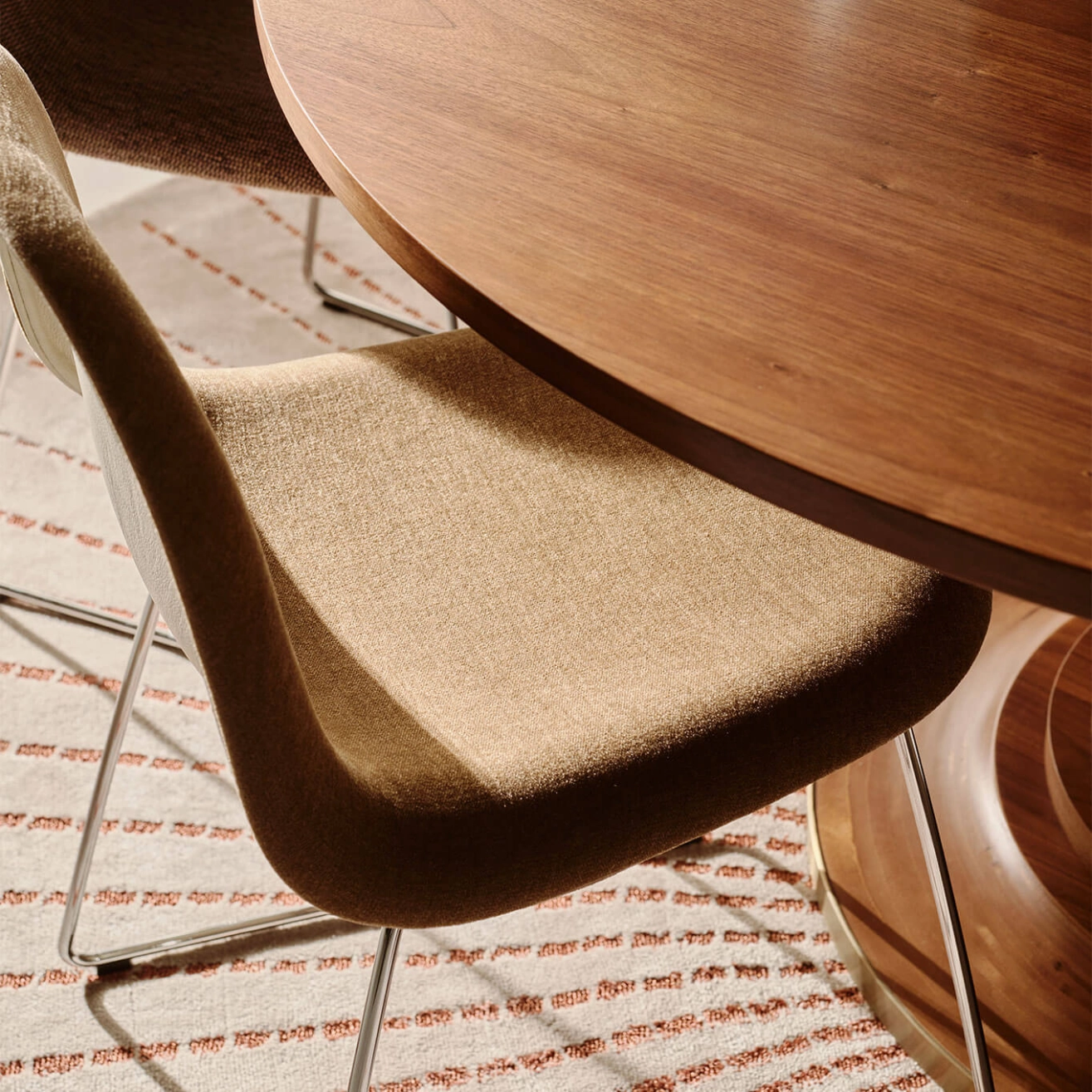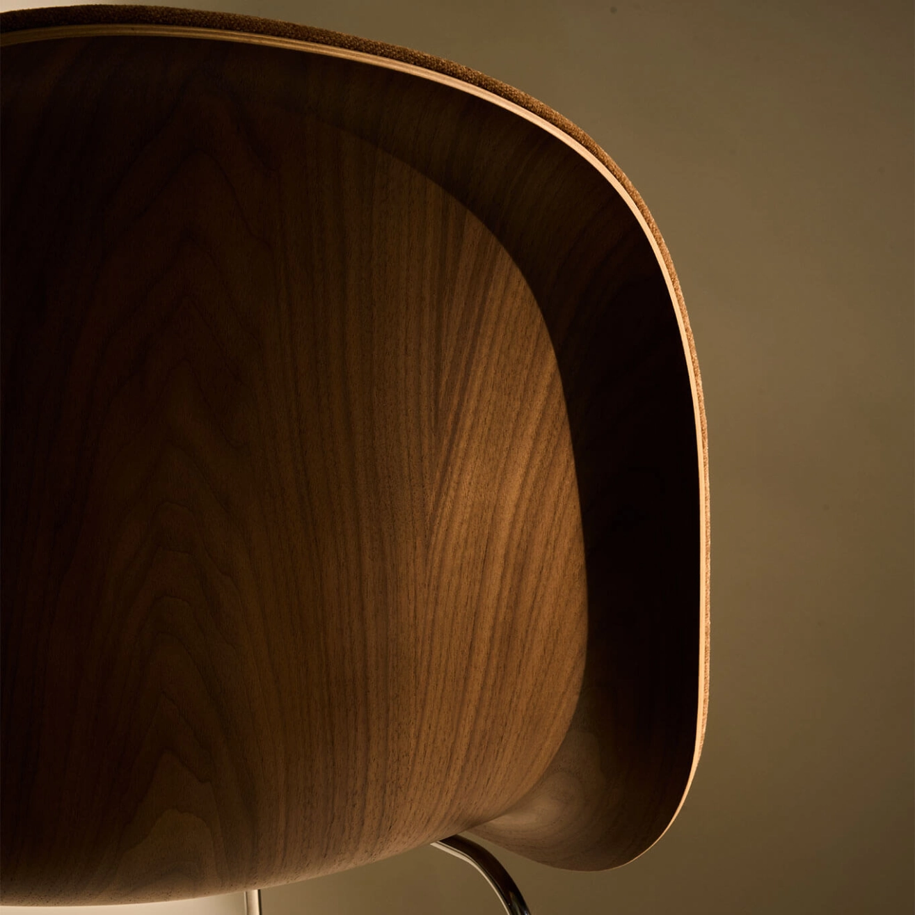 Gubi, takes on its full character in this version that blends timeless elegance with technical craftsmanship. Featuring a front upholstery in Belsuede fabric a refined material with a soft, velvety touch offers a warm and comfortable seating experience that contrasts beautifully with the shell in American walnut veneer, known for its rich and noble grain. This combination of materials highlights the finesse of the 3D design, where the curved edges of the shell gently move away from the body, creating a sense of visual lightness and fluidity. The polished steel base completes the ensemble with a contemporary, gleaming touch that adds both stability and sophistication. This particular version of the 3D Chair perfectly embodies the meeting of organic design, premium materials, and exceptional craftsmanship. More than just a seat, it is a functional, sculptural, and distinctly modern design piece that fits seamlessly into both private interiors and professional spaces.