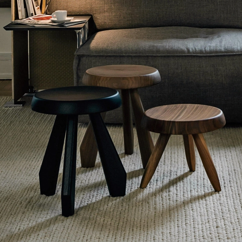 First shown in 1955 at the Synthèse des Arts exhibition in Tokyo, the tabouret 524 Berger is part of a series based on the reinterpretation of local Alpine architecture. Charlotte Perriand, inspired by simple materials and elemental forms, creates a stylised version of the classic milking stool. The tabouret Berger, both simple and robust in solid wood, is available in natural oak, black-stained oak or natural American walnut. Reissued by Cassina, 524 Berger can be paired with the tall version of the stool, Méribel, and used as a side table, at the end of a sofa for example.