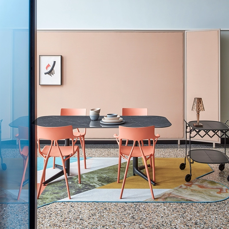 Why do all chairs look the same? How do you create a structurally different chair? At one point, I needed to open a new door...'' explains Philippe Starck about the genesis of the A.I. chair project is the first design chair conceived by artificial intelligence. To create it, Philippe Starck, Autodesk and Kartell asked an artificial intelligence a question: "A.I would you know how to rest our body with the minimum of matter?" A.I., with no culture, no memories, no influence, answered only with intelligence, its artificial intelligence. The creative thinking of Philippe Starck, the know-how Kartell and artificial intelligence have merged to design an A.I model of chair totally elaborated by an algorithm that respects the parameters of the designer and the company, namely to create a chair, comfortable having the structural conditions of resistance and solidity necessary to obtain the certifications and meeting the standards of quality and aesthetics of the collections. A.I is the first chair designed outside our brains, outside our habits of thinking. This chair is also made from a new material: a recycled thermoplastic technopolymer. This material is 100% recycled and comes from pure industrial stock material and production residues that are not contaminated by other materials. It retains the aesthetic quality and structural requirements, while reviving unused industrial equipment, a real innovation from Kartell