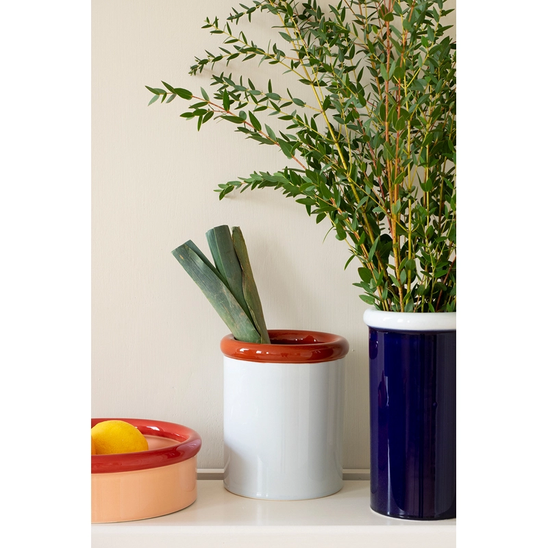 Designed by Julien Renault for the Nine brand, Rod is a collection of ceramic vessels made and painted by hand. This series is inspired by traditional pottery techniques. The Rod family includes a vase, a pot and a bowl, each available in two colour combinations. These colourful pieces can be used on their own to hold flowers, kitchen utensils or fruit, but they can also be combined to create a decorative ensemble. Handcrafting brings a unique character to each piece in the Rod collection.