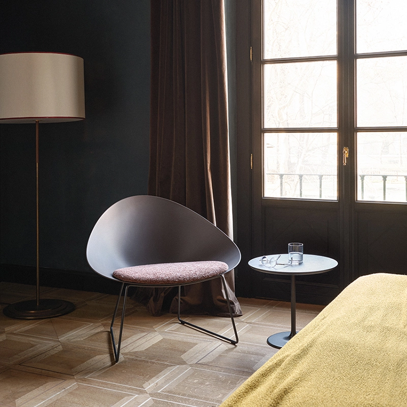 Adell is available in a textured plastic finish, fully upholstered, available with a seat cushion or with a removable cover. The base comes in various styles in metal or wood. These various options combined with timeless aesthetics imbue Adell with infinite possibilities when it comes to usage, offering an exceptionally durable product while contributing to the reduction of waste in our environment.