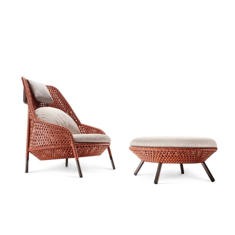 Designed by Stephen Burks for Dedon, Ahnda is an original collection of outdoor armchairs, whose design, ergonomics and comfort are those of a beautiful indoor object. Comprising a two-seater sofa, a lounge chair, a wing chair and a footrest / coffee table, Ahnda seduces with its beautiful openwork weave, inspired by the mixed culture of the Philippines. A real invitation to relax, Ahnda has a perfect inclination that allows you to rest as well as to chat in the garden. Designed to withstand the most extreme weather conditions, this outdoor collection perfectly combines functionality and aesthetics. Price does not include decorative cushion (seat, back and headrest cushions only).