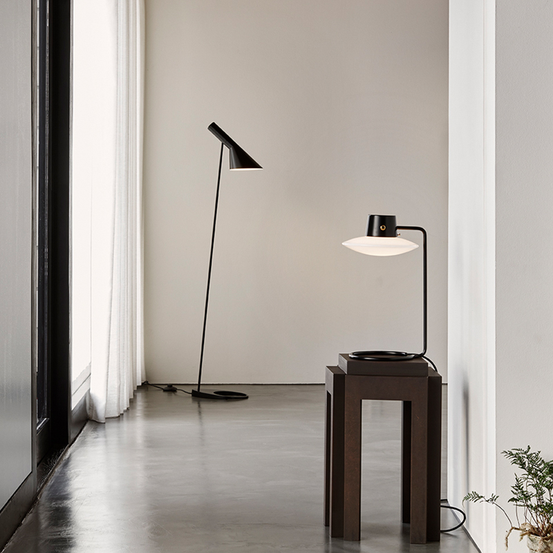 Designed by Arne Jacobsen and published by Louis Poulsen in 1960 for the SAS Royal Hotel in Copenhagen (Radisson Blu), the AJ luminaires were originally part of the complete design concept created for the Hotel. Arne Jacobsen not only drew up the plans for the hotel, but also imagined every detail of its interior design. Many of the products designed for this occasion are now design icons, such as the Egg and Swan armchairs. The AJ lamps have also achieved worldwide renown. The AJ Floor floor lamp is characterised by the distinctive asymmetrical shape of its adjustable shade. The hole in the base underlines the elegance and lightness of the design. Published by Louis Poulsen and available as a table lamp and floor lamp, the AJ luminaires emit downward-directed light. The angle of the lampshade can be changed to optimise lighting. The AJ luminairesfrom Louis Poulsen remain over time modern classics in the field of design luminaires. The inside of the shade is painted white to make the light softer and more comfortable. The AJ Floor is available in three colours: white, black and graphite.