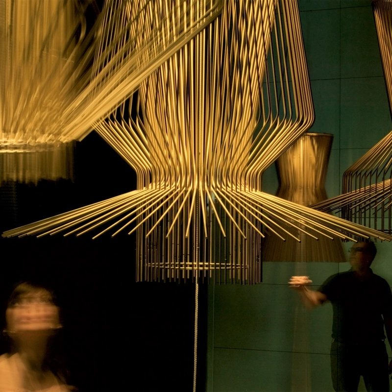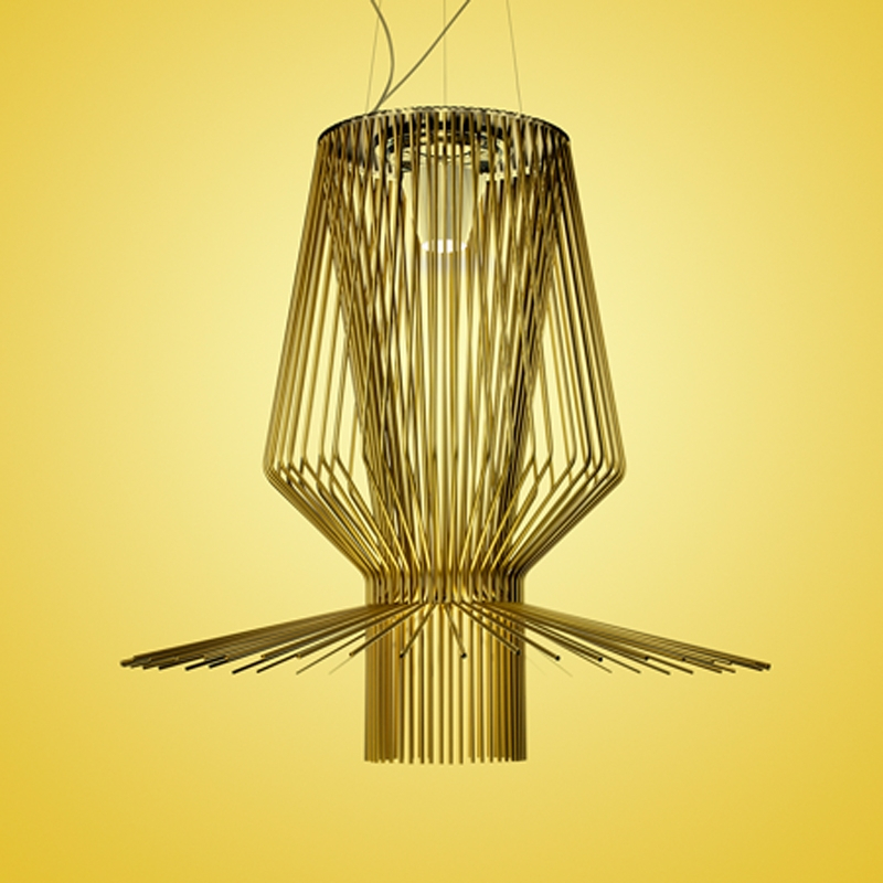 Created by L'Atelier Oï and produced by Foscarini, Allegro Assai is an stunning pendant light made of gilded metal rods. The lines next to each other create a fascinating and refined symphony, in an almost magical balance. Impressive yet subtle, this pendant light is designed to inject character into large commercial and residential rooms.