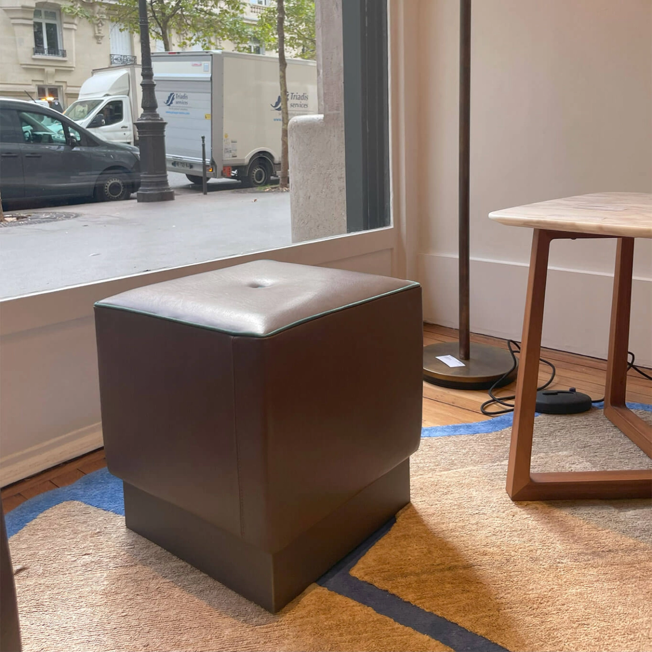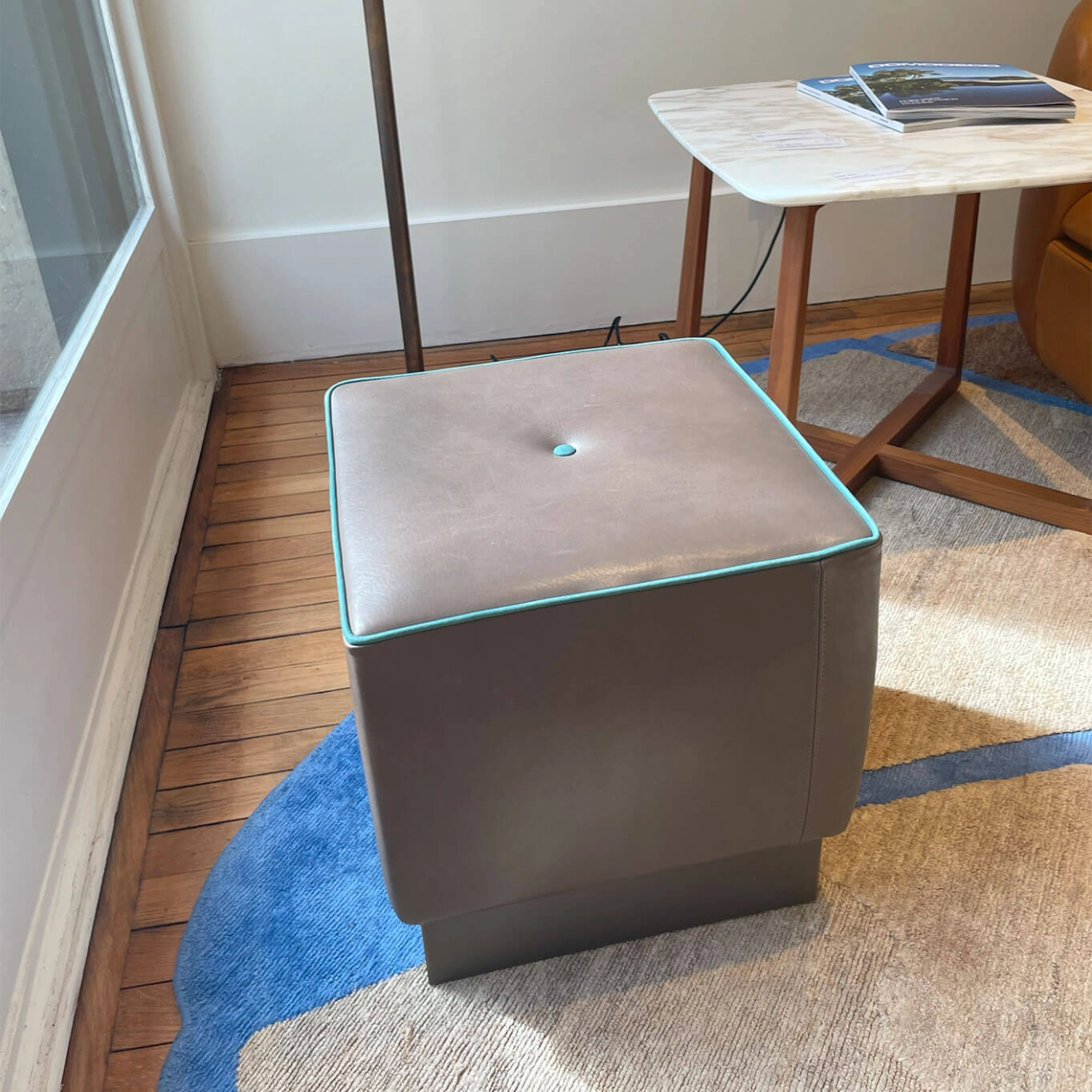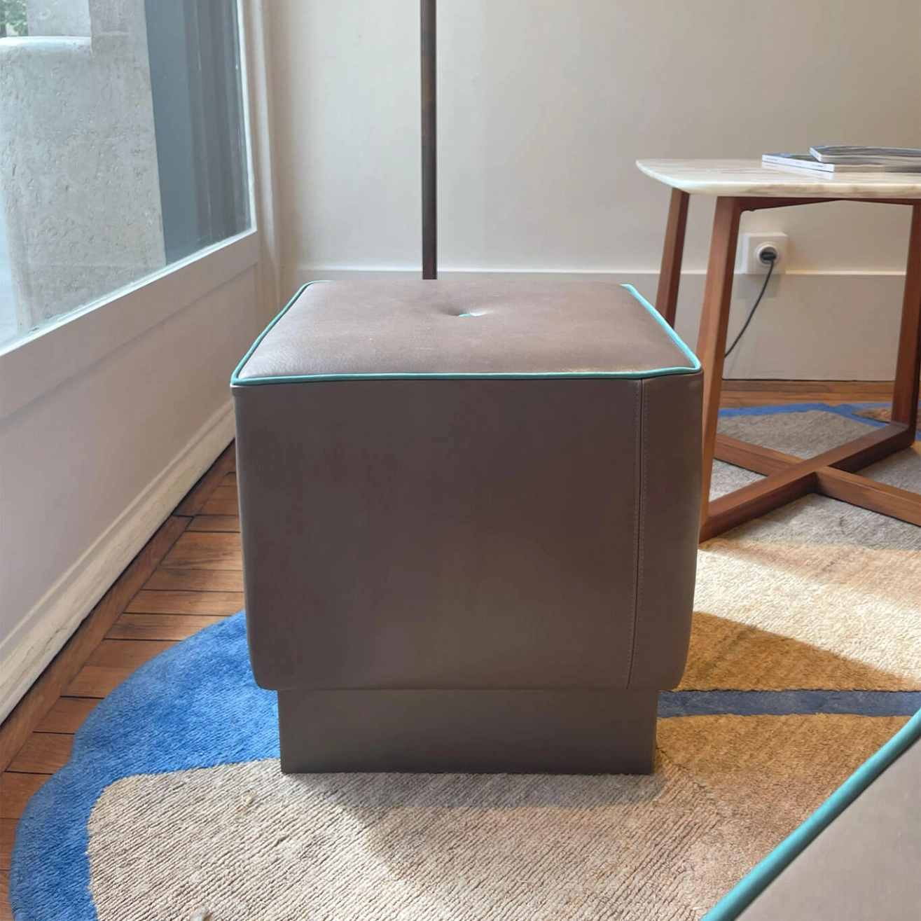 Anais is a designer pouf created by Draga & Aurel for the Italian brand Baxter. This model stands out for its elegant and contemporary look, featuring a high-quality brown aniline leather upholstery enhanced by subtle and refined turquoise green details.