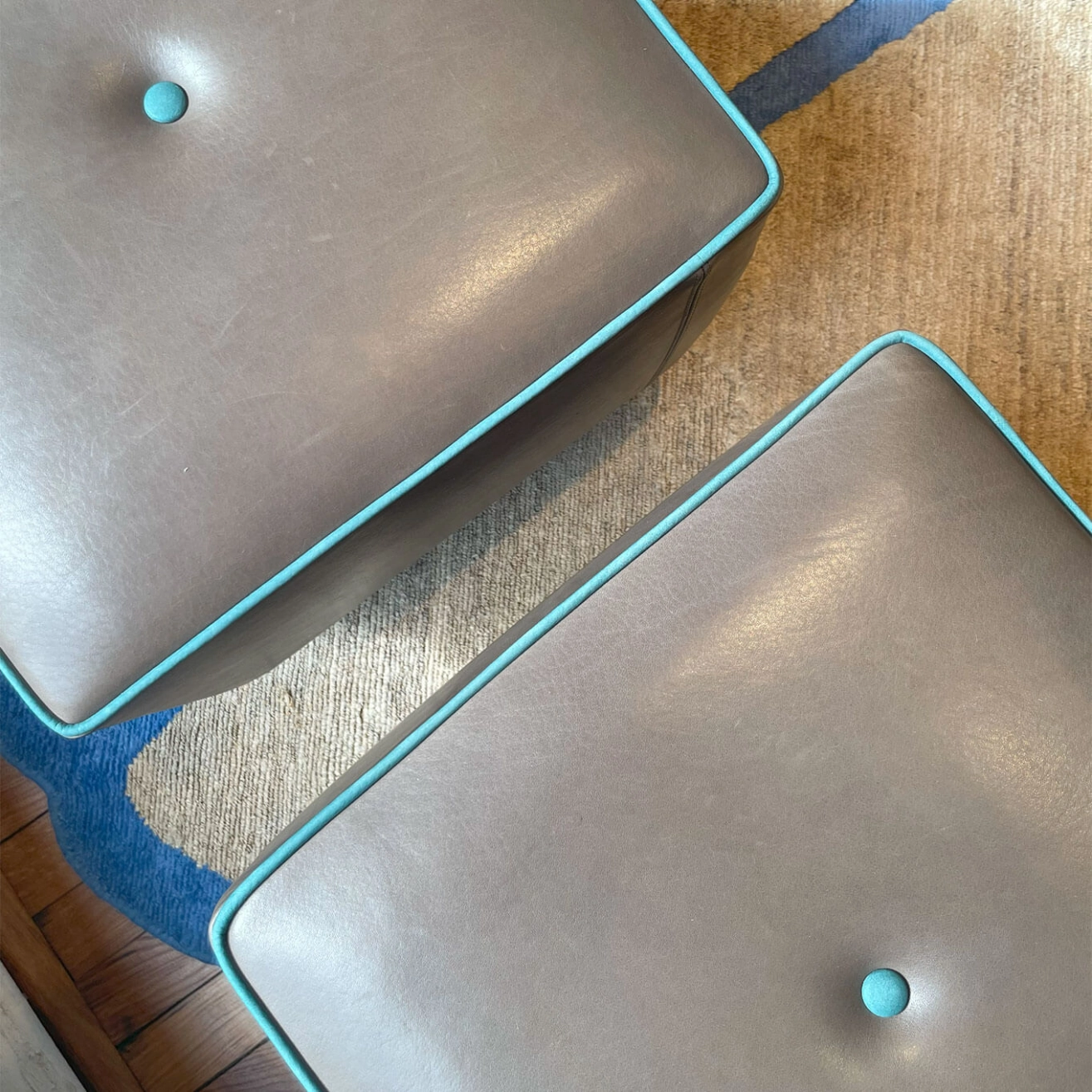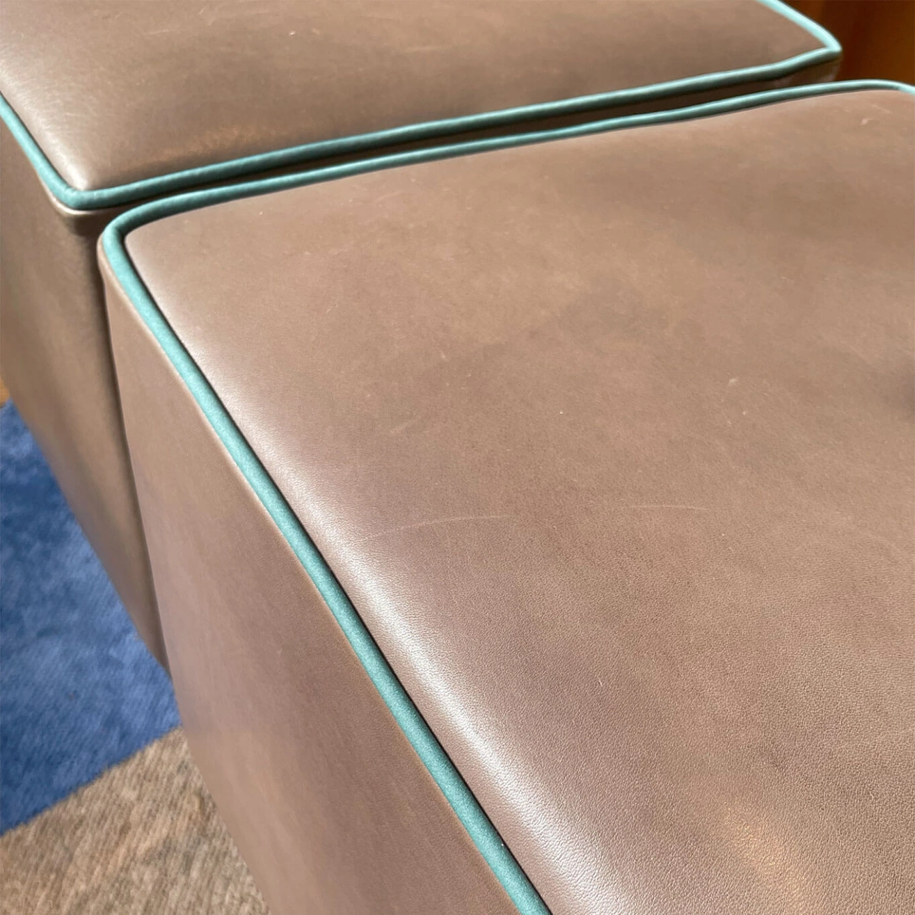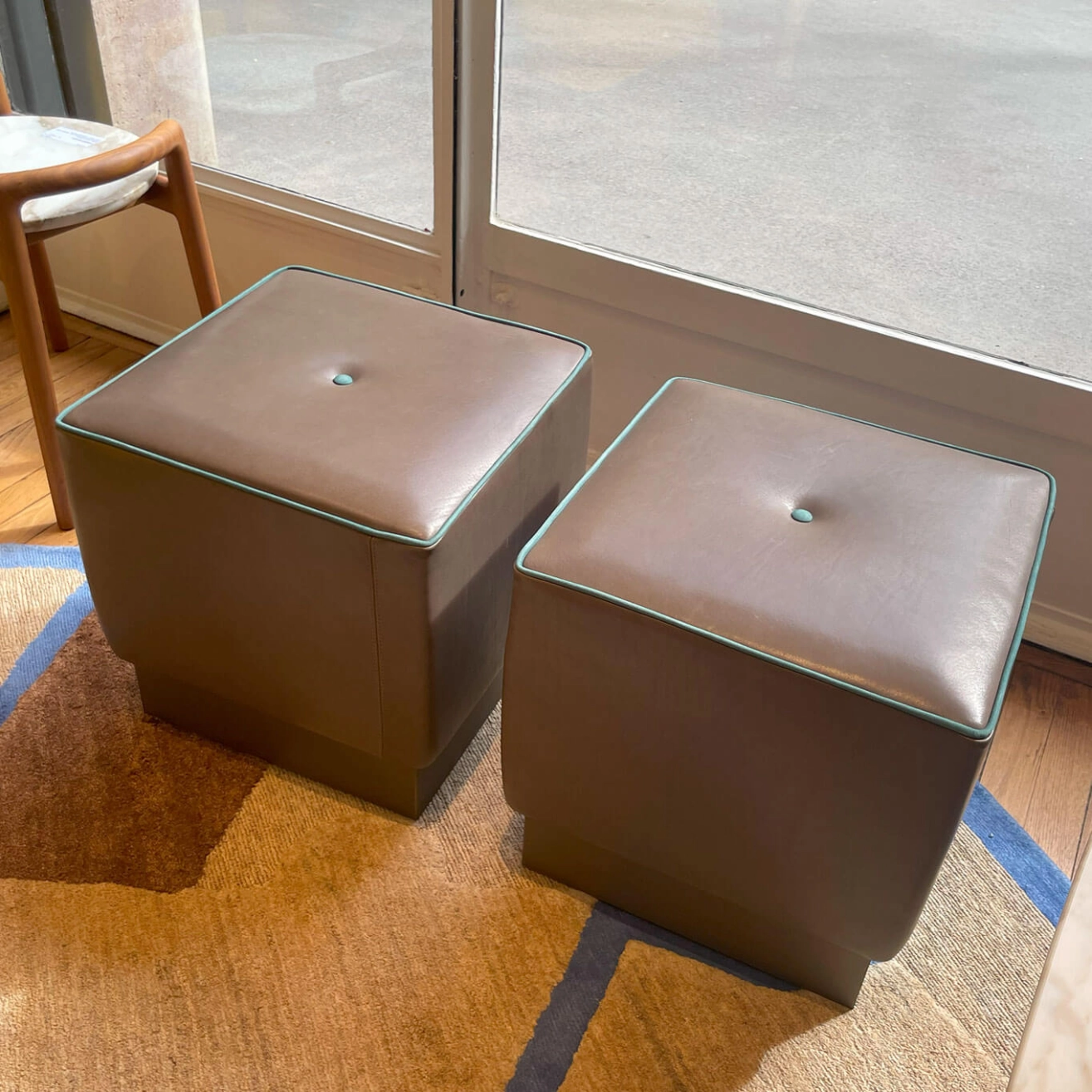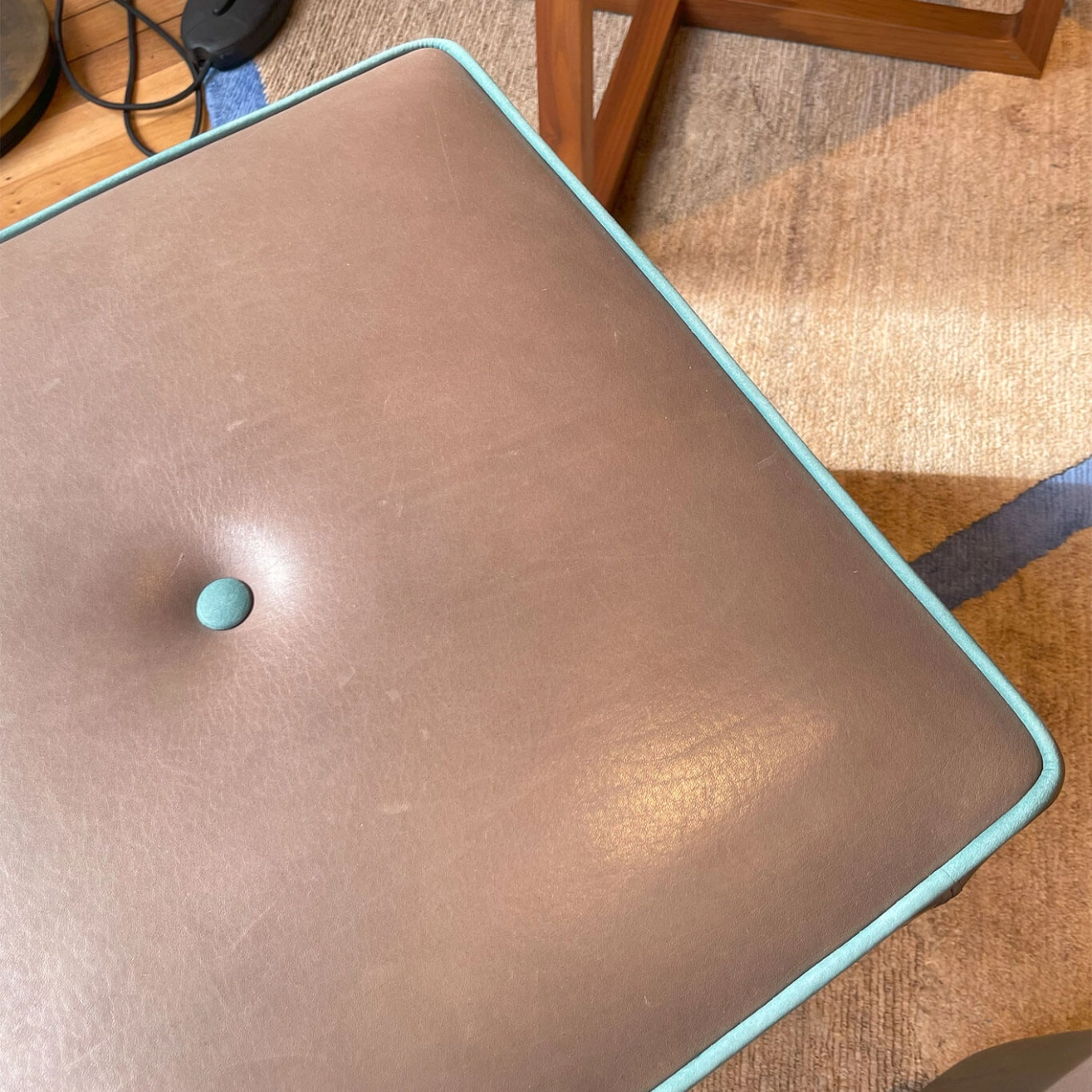 Anais is a designer pouf created by Draga & Aurel for the Italian brand Baxter. This model stands out for its elegant and contemporary look, featuring a high-quality brown aniline leather upholstery enhanced by subtle and refined turquoise green details.