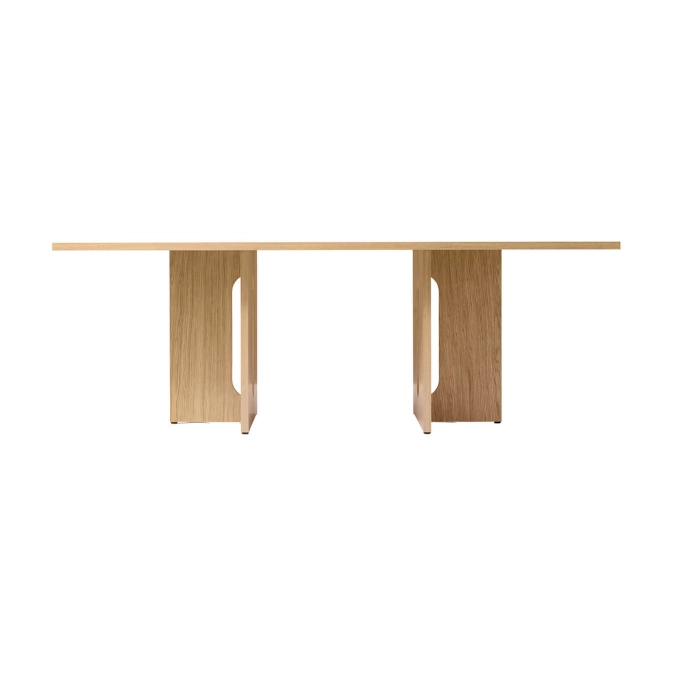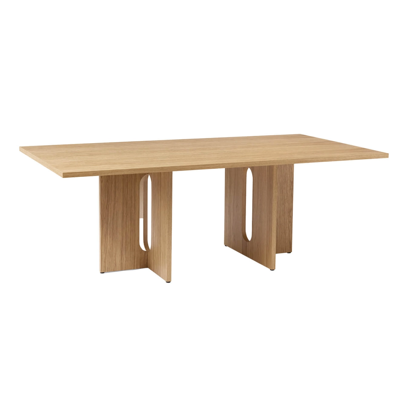 The rectangular table Androgyne Natural Oak Veneer by Audo Copenhagen embodies an approach to contemporary design where the purity of lines and the balance of proportions give rise to an assertive architectural presence. Designed as a generously sized design table, it naturally fits into high-end residential interiors as well as hotel or tertiary projects, finding its place in a dining room, a reception area or a professional environment, where she structures the space with elegance and fluidity. Its natural oak veneer finish brings brightness and warmth, while its rectangular format of promotes friendly and shared uses, from large meals to meetings, while offering a fluid reading of the volumes. True to the DNA of Audo Copenhagen, the Androgyne table favours a balance between form and function, making furniture a real element of interior architecture. Thought as an object of sustainable design, it fits naturally into the project, combining quality of design, timeless aesthetics and experience of use in the service of spaces.
