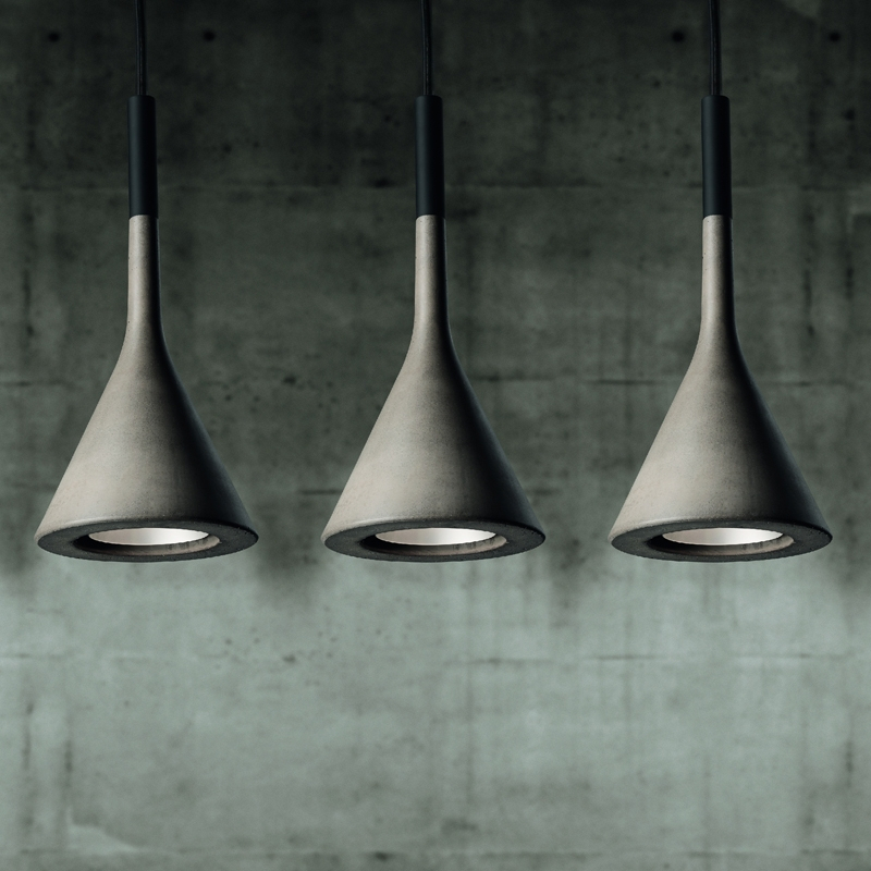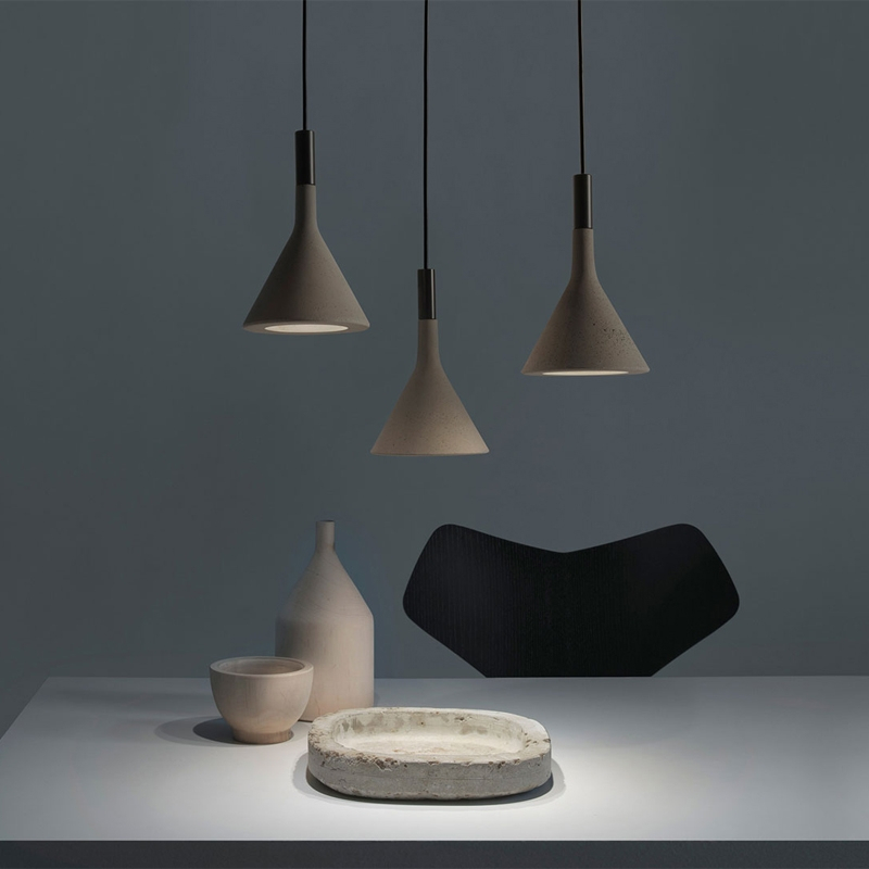 The Aplomb suspension, created by Paolo Lucidi and Luca Pevere for Foscarini, is very much defined by its name. This suspension features a light, elegant design with clean lines that counterbalances the solidity of the material, while enhancing its raw yet refined texture. With its downward-focused beam of light, Aplomb by Foscarini is ideal above a table or in a kitchen, on its own or as part of a composition. The Aplomb suspension is also available in mini and wide versions.