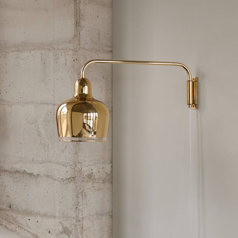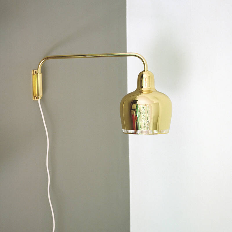 The A330S wall lamp is based on the same model as the suspension of the same name, nicknamed the "Golden Bell". Like the pendant, the wall A330S has a sculptural quality that can be appreciated whether the light is on or off. With its golden highlights, the perforated edge of the A330S wall light creates a memorable halo effect and prevents glare. Crafted from a single piece of brass or steel, the elegant "Golden Bell" was created by Aino and Alvar Aalto for the interior of The Savoy restaurant in Helsinki in 1937 and was subsequently displayed in the Finnish pavilion at the Paris World Fair the same year. The "Golden Bell" embodies the clean aesthetic characteristic of Alvar Aalto, while the light it provides is both warm and diffused.