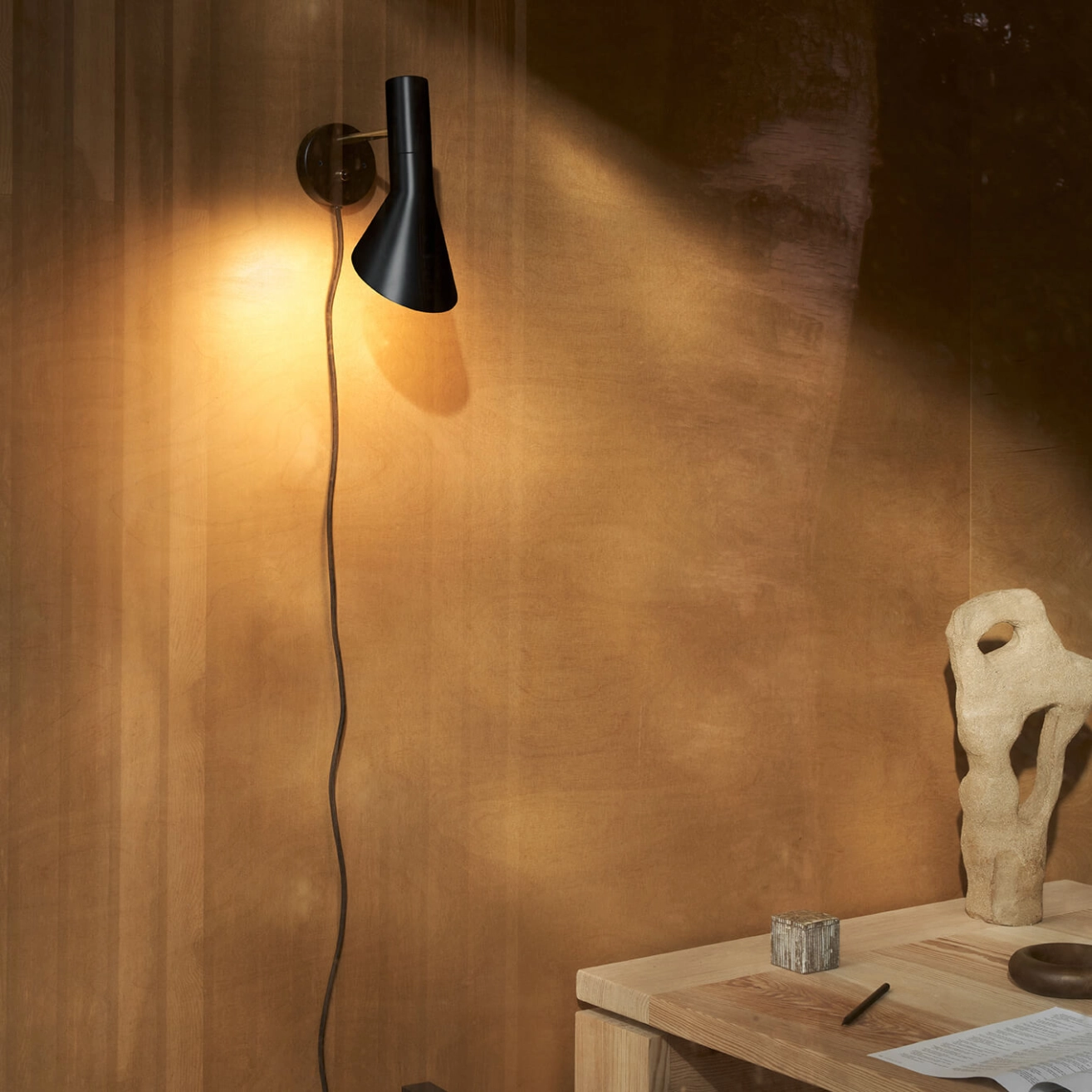 Designed by Arne Jacobsen and published by Louis Poulsen in 1960 for the SAS Royal Hotel in Copenhagen (Radisson Blu), the AJ luminaires were originally part of the complete design concept created for the Hotel. Arne Jacobsen not only drew up the plans for the hotel, but also imagined every detail of its interior design. Many of the products designed for this occasion are now design icons, such as the Egg and Swan armchairs. The applique AJ is characterised by the distinctive asymmetrical shape of its adjustable shade. It consists of a round base, a tubular base and a truncated conical diffuser. The inside of the shade is painted white to make the light more comfortable. The adjustable diffuser and interior of the applique AJ Wall is painted white, to make the light softer and more comfortable. This wall light combines pure, timeless design with excellent lighting qualities. Now seen as an icon of Scandinavian design, it is synonymous with elegance and lightness. The applique AJ emits an asymmetrical, direct and powerful light, directed downwards. The AJ lamps have also achieved worldwide renown. The AJ luminaires by Louis Poulsen remain over time modern classics in the field of design luminaires
