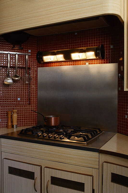 verre borosilicate, bouchons fonte d'aluminium et silicone, colliers inox, mailles laiton, réflecteurs aluminium et inox