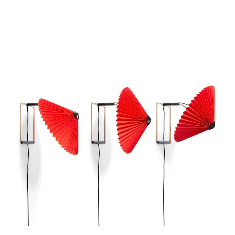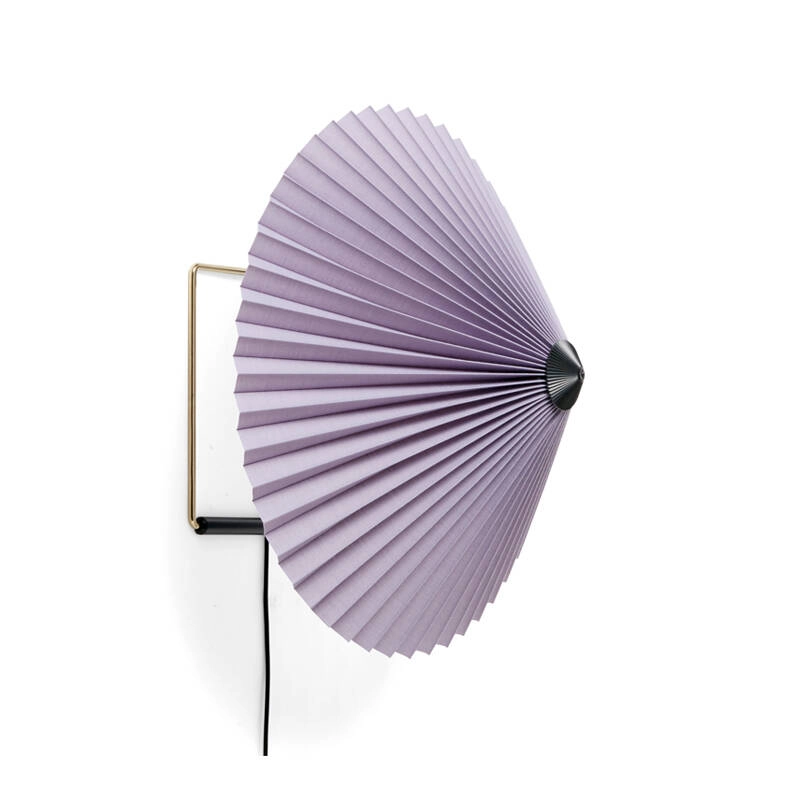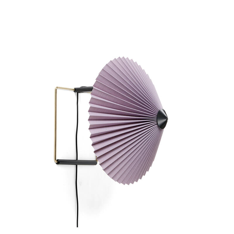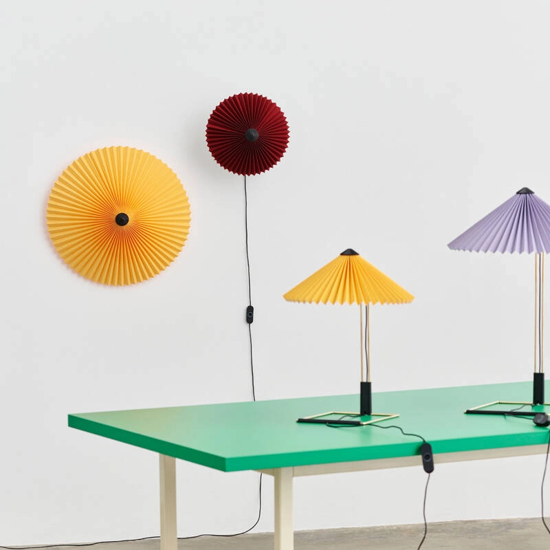 Designed by Inga Sempé for Hay, the applique Matin offers a design that is both contemporary and poetic, with a construction that combines visual finesse and physical robustness. The lamp head can be tilted upwards or downwards at an angle of around 45 degrees, creating ambient or direct light. The Morning wall light features a steel wire frame finished in polished brass and a pleated cotton shade available in two diameters and a variety of bright colours. The light source is an integrated LED, providing diffused light. Matin is also fitted with a digital dimmer, allowing the brightness to be adjusted as required.