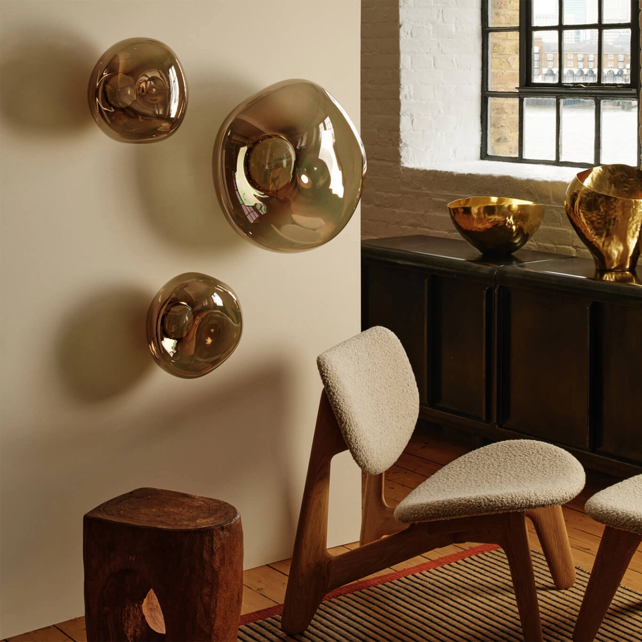 The result of a collaboration between Tom Dixon and the Front design studio, Melt is a collection of luminaires as innovative as they are poetic. The Applique Melt Surface Mini boasts a beautiful distorted globe of light that creates a striking effect of molten blown glass. The diffuser is translucent when switched on, and has a mirror finish when switched off. The Tom Dixon Melt Applique emits an attractive, slightly hallucinogenic light, reminiscent of images of the cosmos taken by the Hubble telescope. Melt by Tom Dixon is available in a range of refined finishes and also as a suspension and table lamp.
