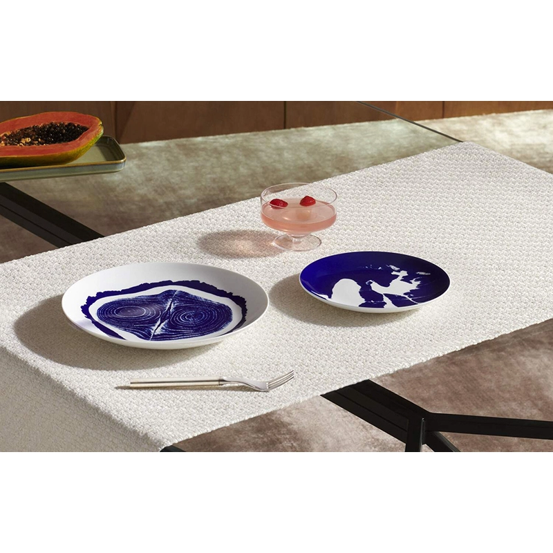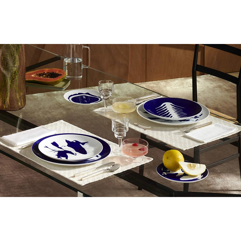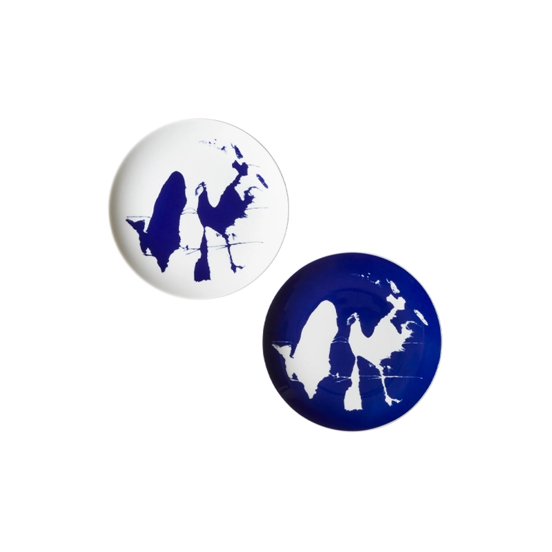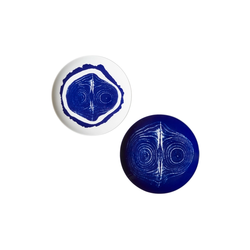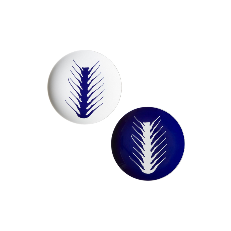plates reflects her creative legacy. Each piece, comprising a trivet, dinner plate, soup plate and garnishing plate, is sold in sets of two. The porcelain is hand-decorated in blue and white, sporting motifs inspired by photographs by