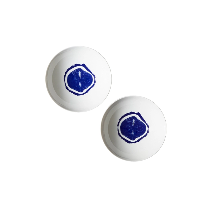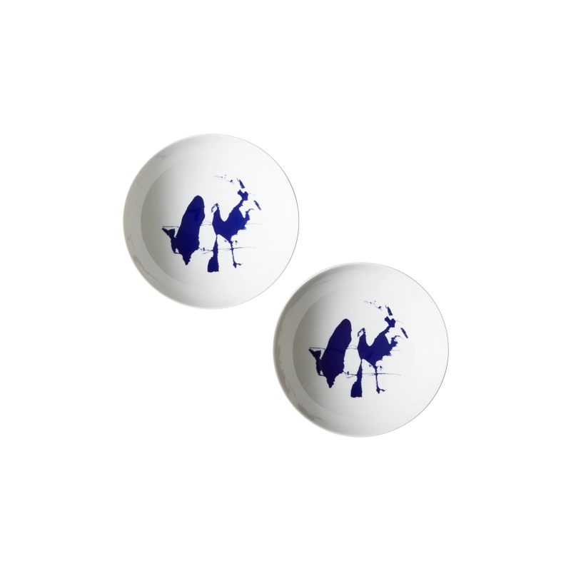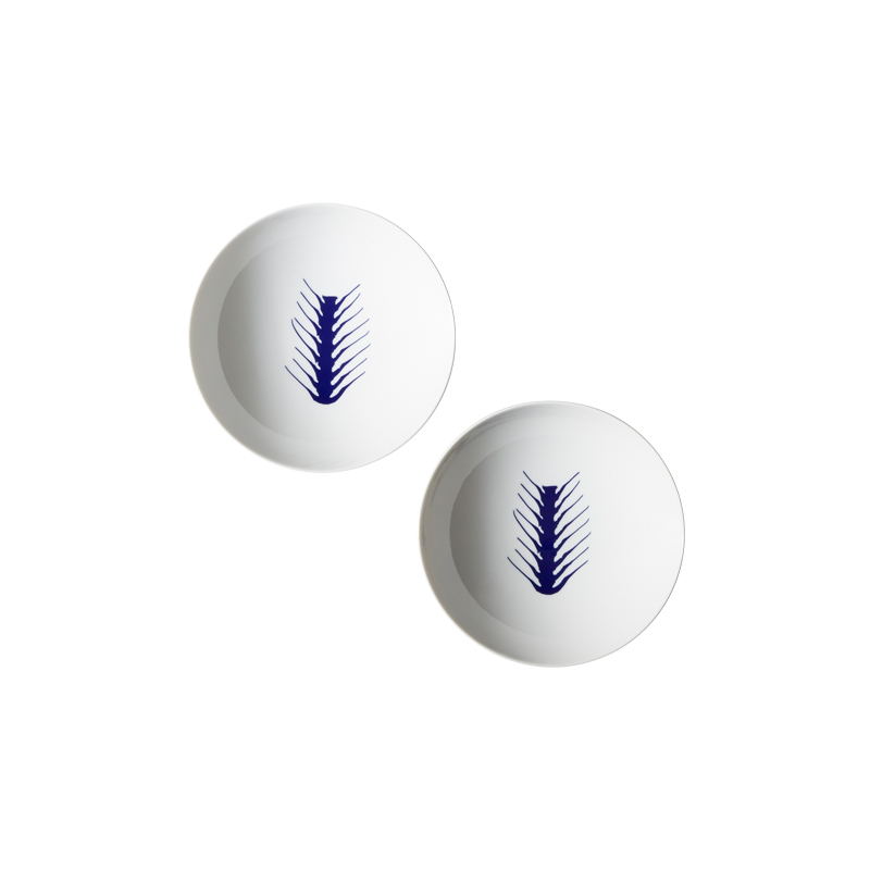 plates reflects her creative legacy. Each piece, comprising a trivet, dinner plate, soup plate and garnishing plate, is sold in sets of two. The porcelain is hand-decorated in blue and white, sporting motifs inspired by photographs by