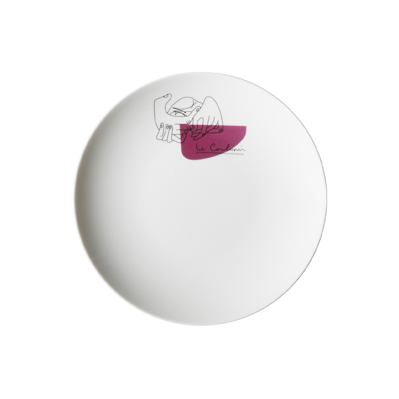 The collection of Prunier crockery is the result of collaboration between Cassina, Ginori 1735 and the Le Corbusier Foundation. Designed by Le Corbusier in 1961 for the eponymous London restaurant, each white porcelain piece is delicately hand-decorated with the original motif of intertwined hands, inspired by the tapestry "Les Mains" created in 1951. The set from the Prunier collection, comprising a plain plate, a soup plate, a dessert plate and a coffee cup with saucer, embodies the taste for form advocated by Le Corbusier. This re-edition by Cassina in collaboration with Ginori 1735, sold as a set of 2, combines the modernist design genius of Le Corbusier with the Italian craftsmanship excellence infused by Cassina and Ginori 1735, creating a table steeped in history and timeless elegance.