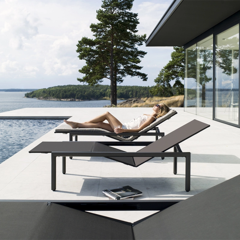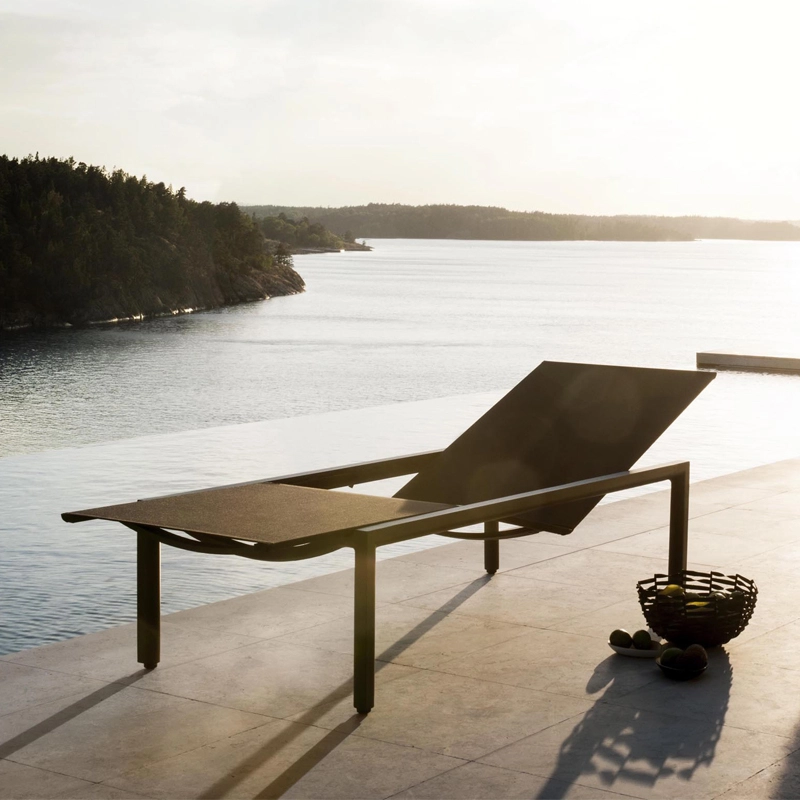 As well as being adjustable, the Illum chaise longue from Tribu lowers to provide unparalleled comfort, while all its mechanisms - a newly developed pump system - are cleverly camouflaged. The aluminium structure is powder-coated and easy to maintain. The Batyline seat ensures that Illum is tough as nails and provides excellent protection against UV rays, stains and mould.