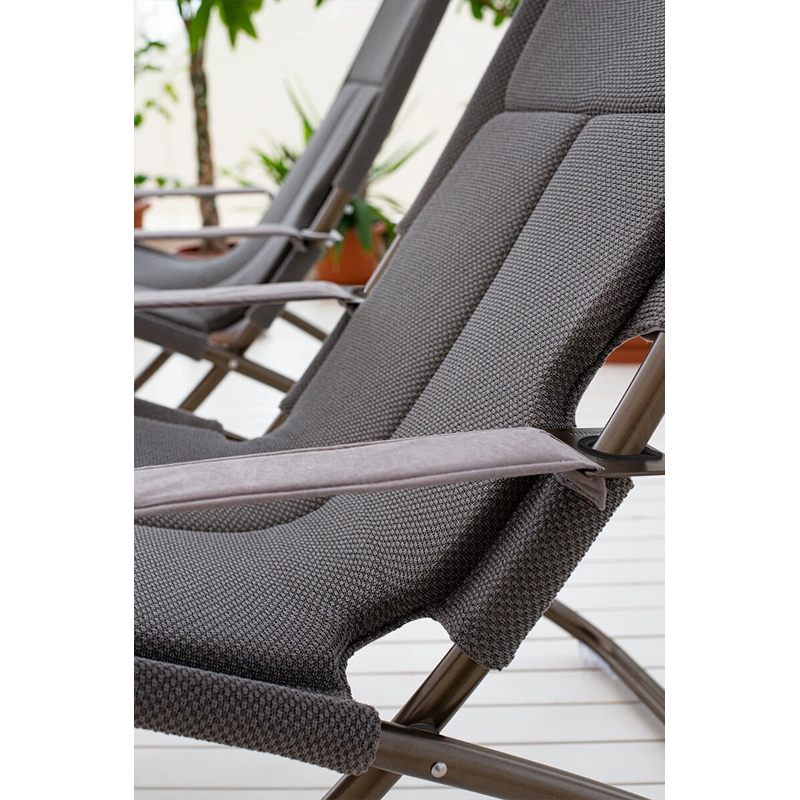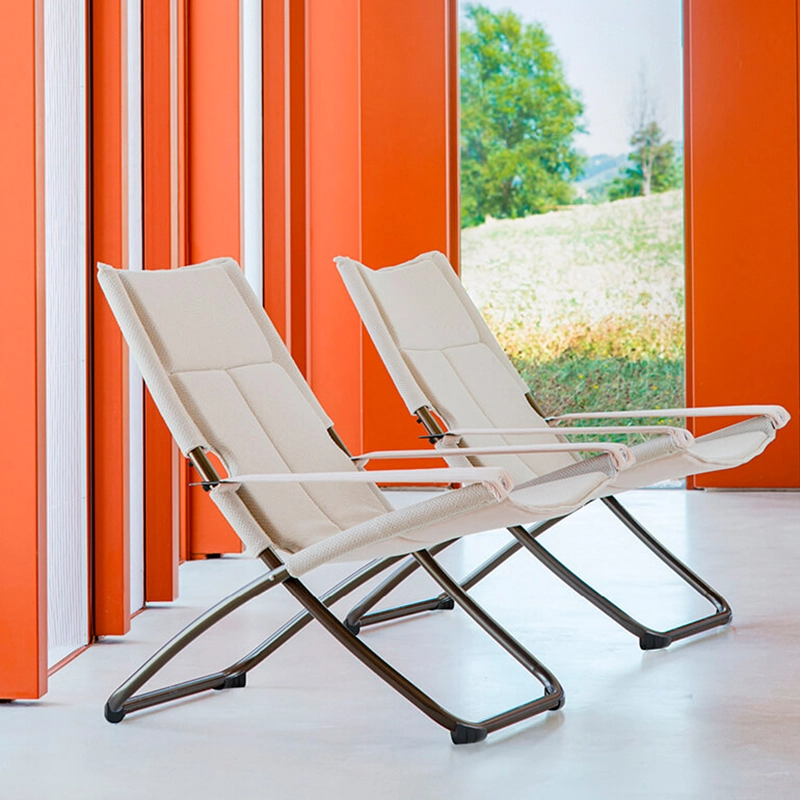 Large dimensions and a sinuous, enveloping shape: these are the characteristics of Snooze by Chiaramonte & Marin. The structure is in tubular steel, available in a range of colours combined with fabric variants. All metal components are insulated from each other with plastic elements. A real invitation to relax, the Cozy deckchair has been designed for both indoor and outdoor use.