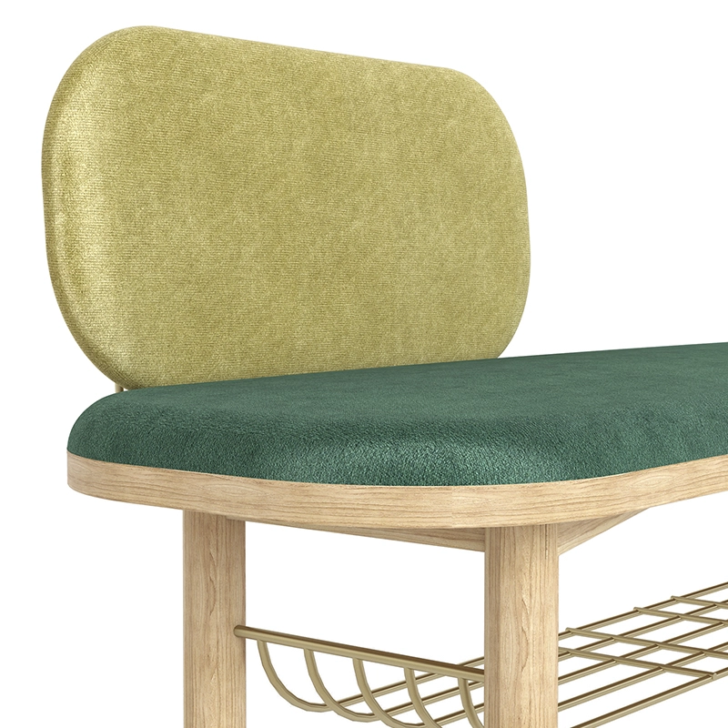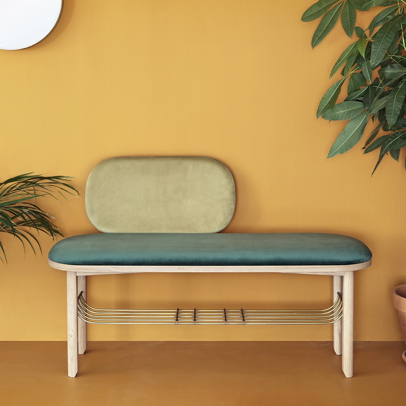 Eustache is a natural oak occasional bench designed by Margaux Keller for HARTÔ. The elegant velvet seat hides a brass-effect metal basket that structures the model and provides additional storage. Eustache shows subtlety in its design: its ballerina-style legs on demi-pointes or its rounded backrest, give it a modernity that crosses the ages, like a young Moustachu dandy from Proust or Baudelaire... This Harto upholstered bench is perfect for the entrance hall.