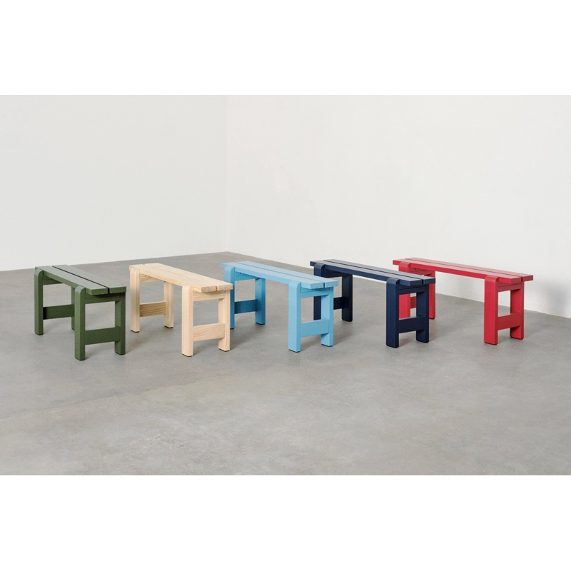 Designed by designers Hannes & Fritz for Hay, Weekday is a collection of outdoor benches and tables. Inspired by the idea of bringing people together, the Weekday bench combines a sturdy, massive presence with gently rounded articulations, bringing a warm, familiar feel that invites sharing a meal in a convivial atmosphere. The Weekday collection is made from solid pine wood, which will take on a beautiful patina over time and last for many years. The robust yet universal nature of the Weekday collection, combined with its various size options and weather-resistant water-based treatment, makes it suitable for outdoor use.