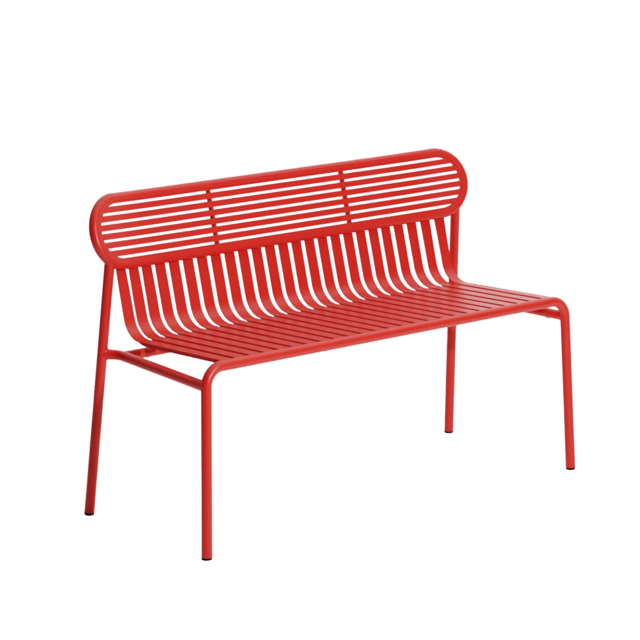 With Week-End, the French brand Petite Friture, takes its singular look at summer and, with the Brichet-Ziegler studio, offers a graphic and contemporary approach to garden furniture. It plays on a rhythm of horizontal and vertical bands skilfully laid over a structure with strong lines. The strips on this bench, which characterise the Week-End collection published by Petite Friture, are made from laser-cut aluminium sheets in a single piece rather than assembled slats, allowing the elimination of uncomfortable screws or welds. The slats, like the stripes, emphasise the fullness and emptiness, affirming the identity of the collection. The Week-End collection is a complete outdoor furniture range. The precise colours selected for this collection mark the skyline of a balcony, terrace or garden, alone or in combination. This bench is available in a range of colours, including black, yellow and jade green. The colours in the Week-end collection, by Petite Friture, are finished in grained anti-UV epoxy powder paint, guaranteeing that the colours will hold up impeccably over time. The design bench proposed by Petite Friture has been conceived with the obsession of making the most of the materials and production techniques available to designers. Made from aluminium, a material selected for its lightness and weather resistance, the Week-End collection combines aesthetic comfort with practicality. This collection has been designed for practical use, because all the seats are stackable.