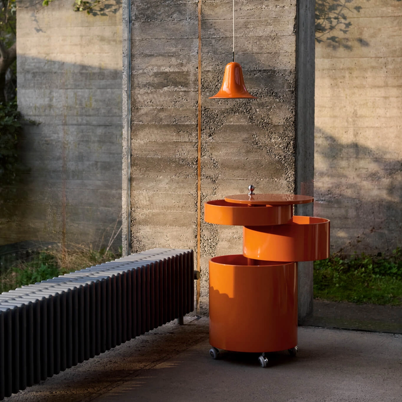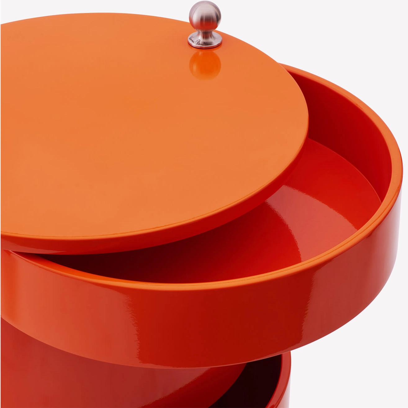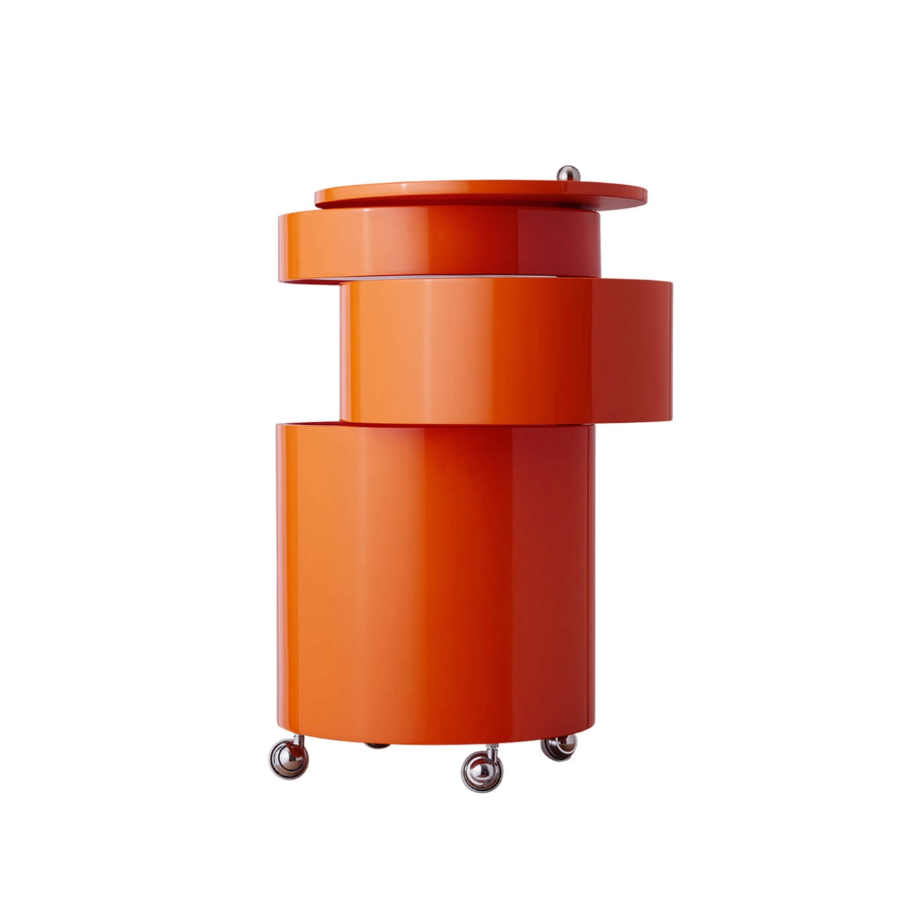 The Barboy by Verner Panton serves as both a side table and a mobile storage unit. It consists of four cylindrical sections that pivot outward, allowing the user to access and view the full surface of the storage trays. Published by VERPAN, the Barboy storage unit perfectly exemplifies Verner Panton’s work. It combines a matte surface with a chrome handle and casters, creating an elegant contrast between functionality and iconic design.