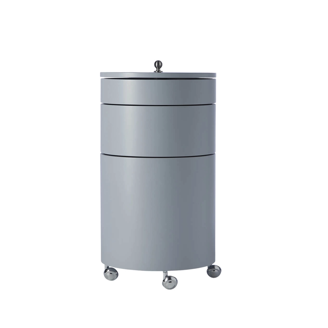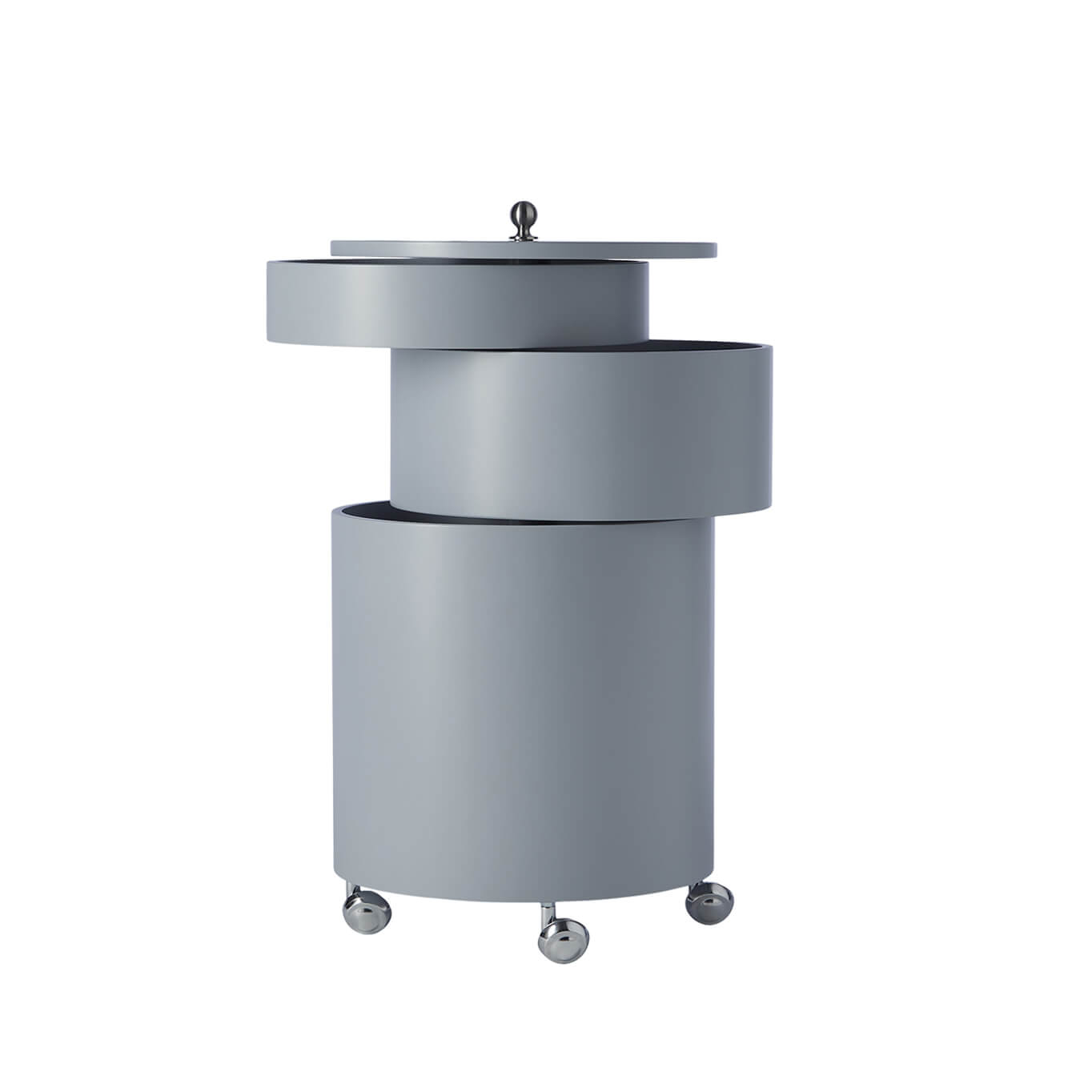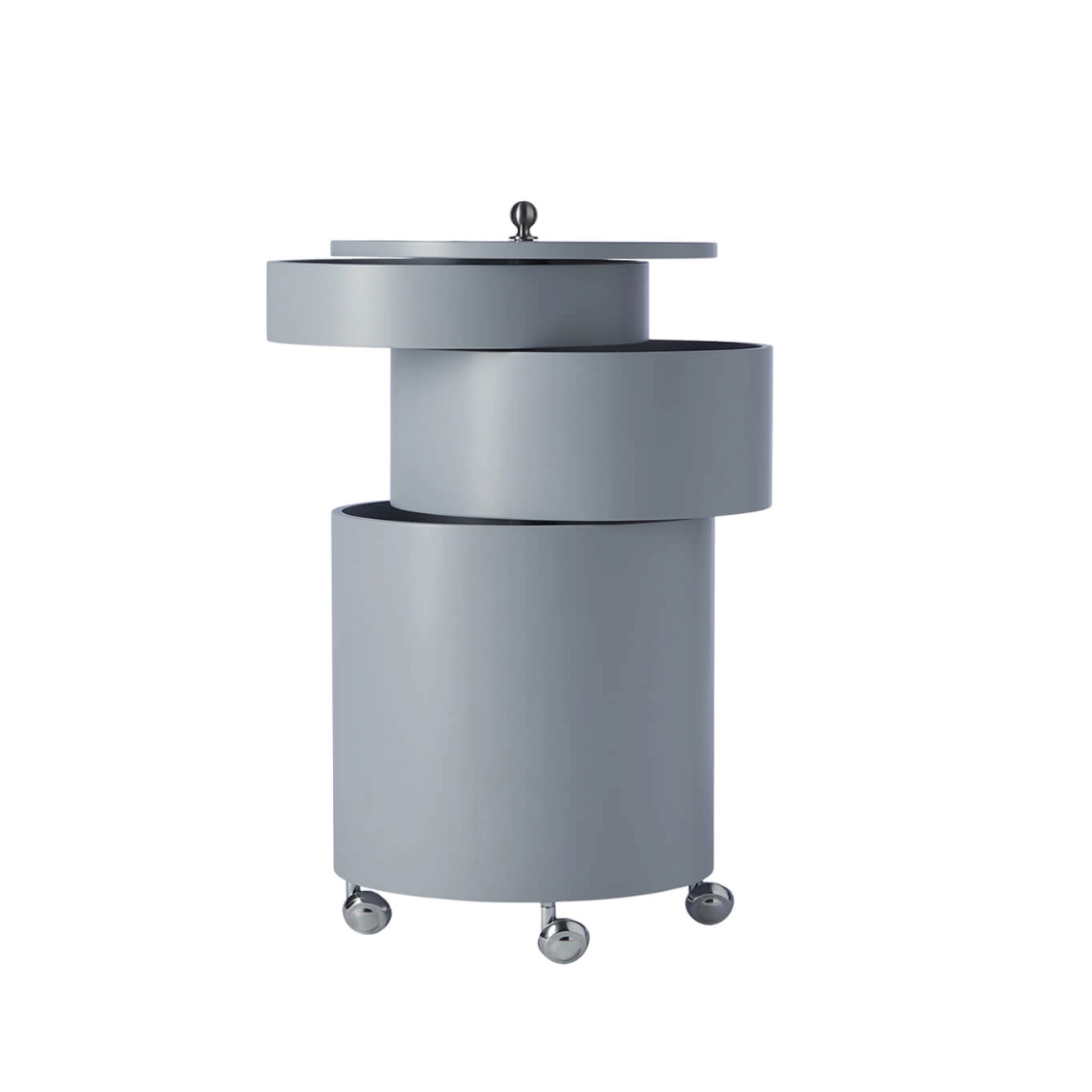 The Barboy by Verner Panton serves as both a side table and a mobile storage unit. It consists of four cylindrical sections that pivot outward, allowing the user to access and view the full surface of the storage trays. Published by VERPAN, the Barboy storage unit perfectly exemplifies Verner Panton’s work. It combines a matte surface with a chrome handle and casters, creating an elegant contrast between functionality and iconic design.