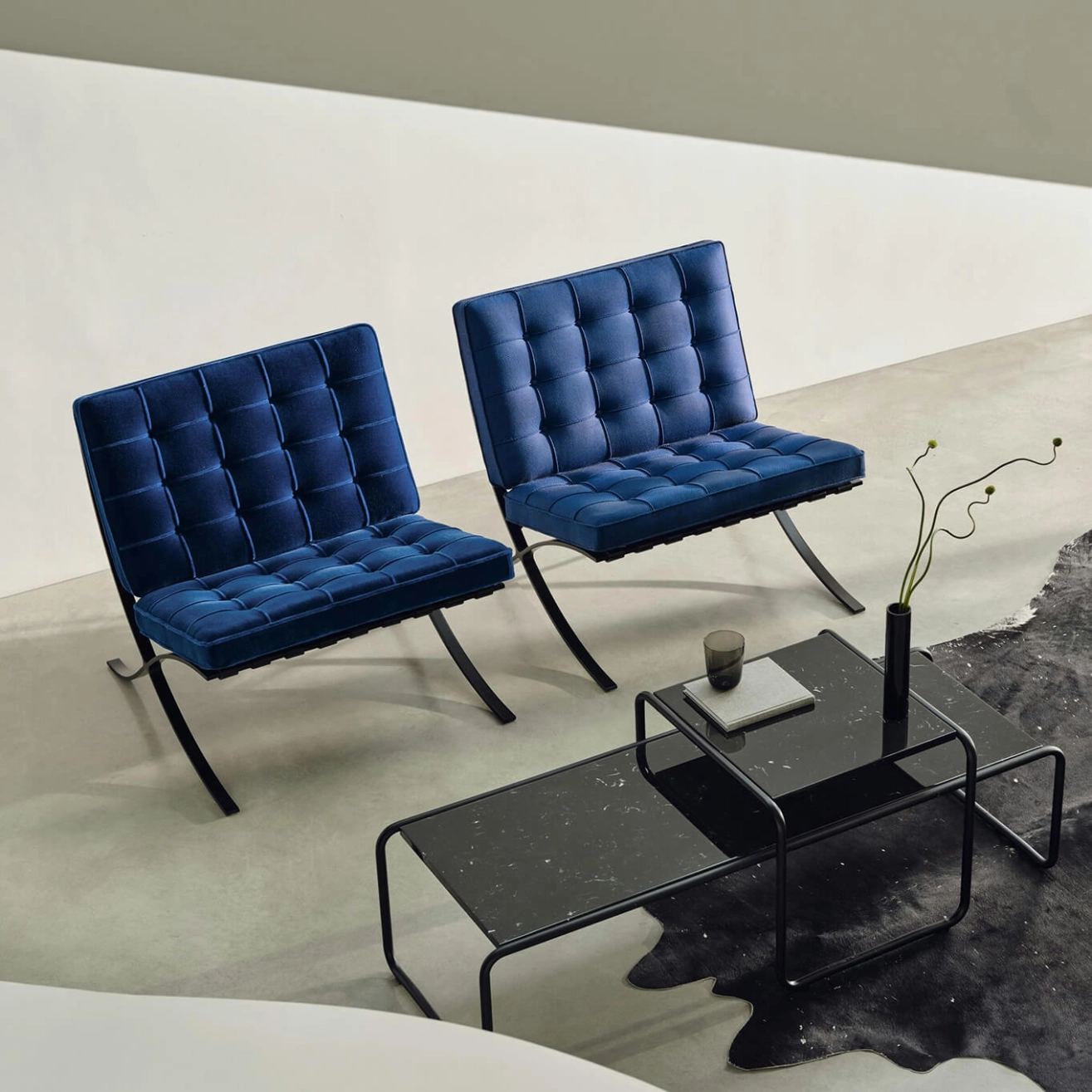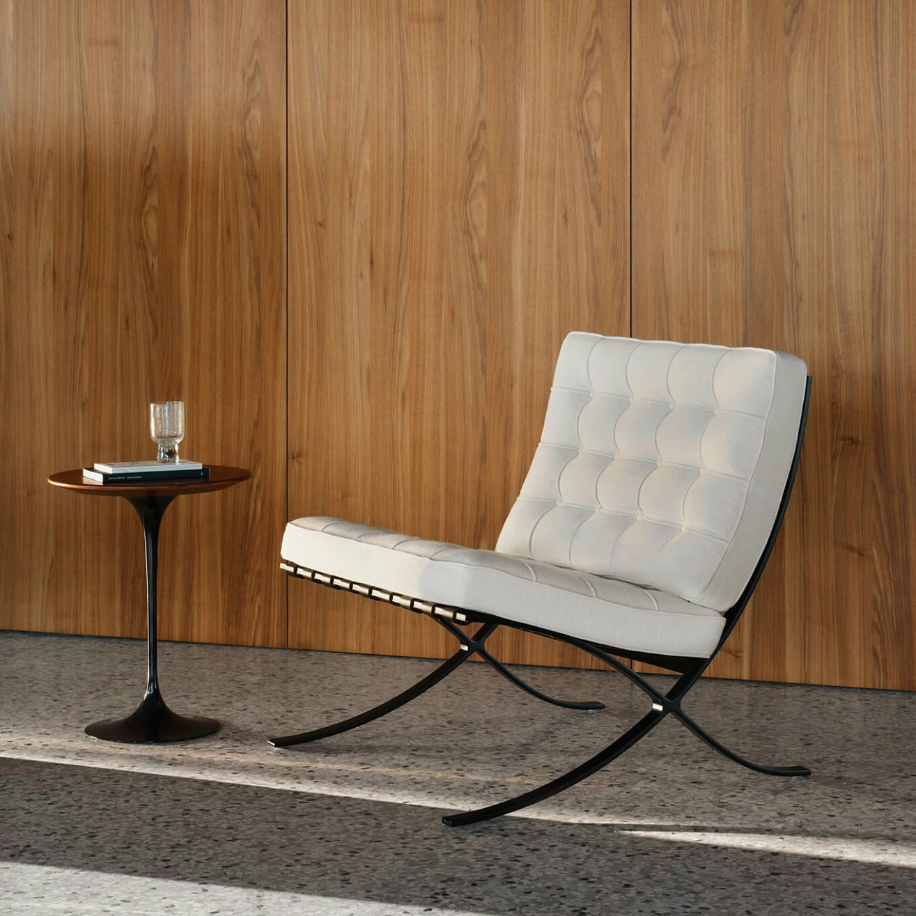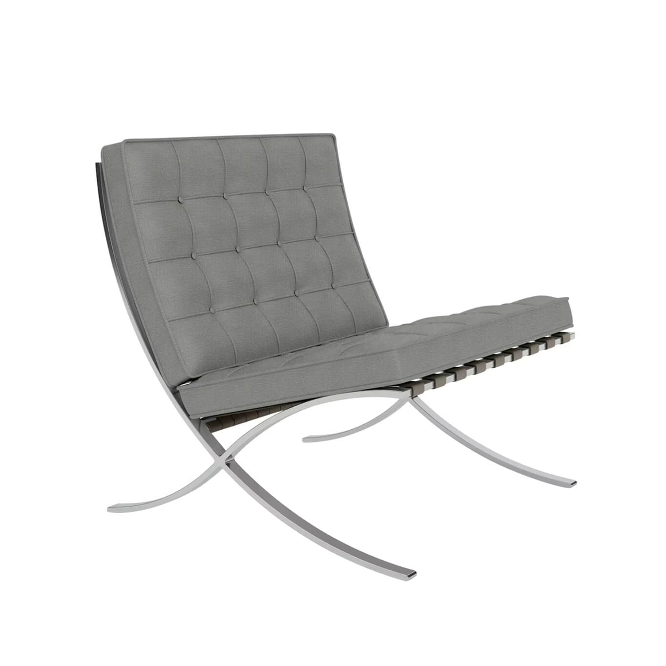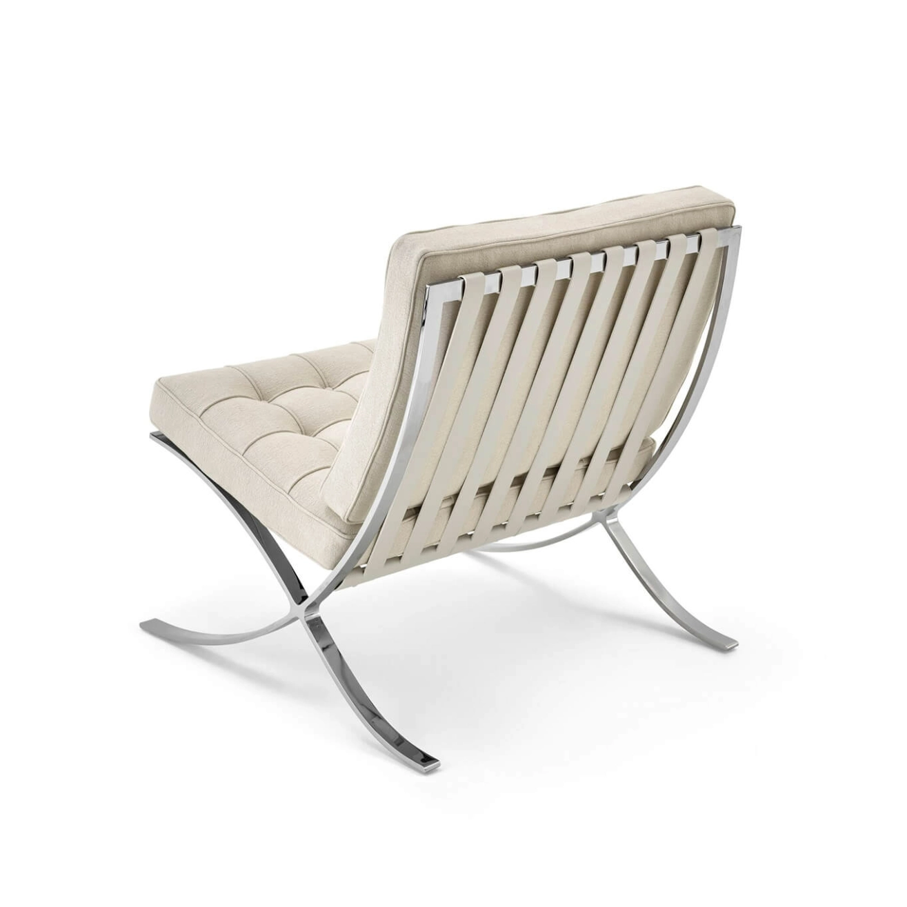 Created by Ludwig Mies van der Rohe for the German Pavilion at the 1929 International Exhibition in Barcelona, the Barcelona Chair has become an icon of modern architecture. Its refined composition reflects the very essence of modernist design. From its elegant crisscross frame to its cushions made of meticulously hand-stitched and assembled squares, each chair is a tribute to the union of contemporary design, high-end craftsmanship, and exceptional attention to detail. Architectural in form, the Barcelona Chair features a canted seat that offers a posture both relaxed and perfectly supported. It is upholstered in Haven fabric, available in four different colors, and features a polished chrome frame. To create the cushions, 40 individual squares of fabric are hand-sewn and tufted with buttons. The cushions are secured to the frame using belting leather straps, with edges dyed to match the upholstery. Each Barcelona Chair is an authentic piece designed by Ludwig Mies van der Rohe. The frame is stamped with the Knoll logo and the designer’s signature, certifying its authenticity and timeless value.