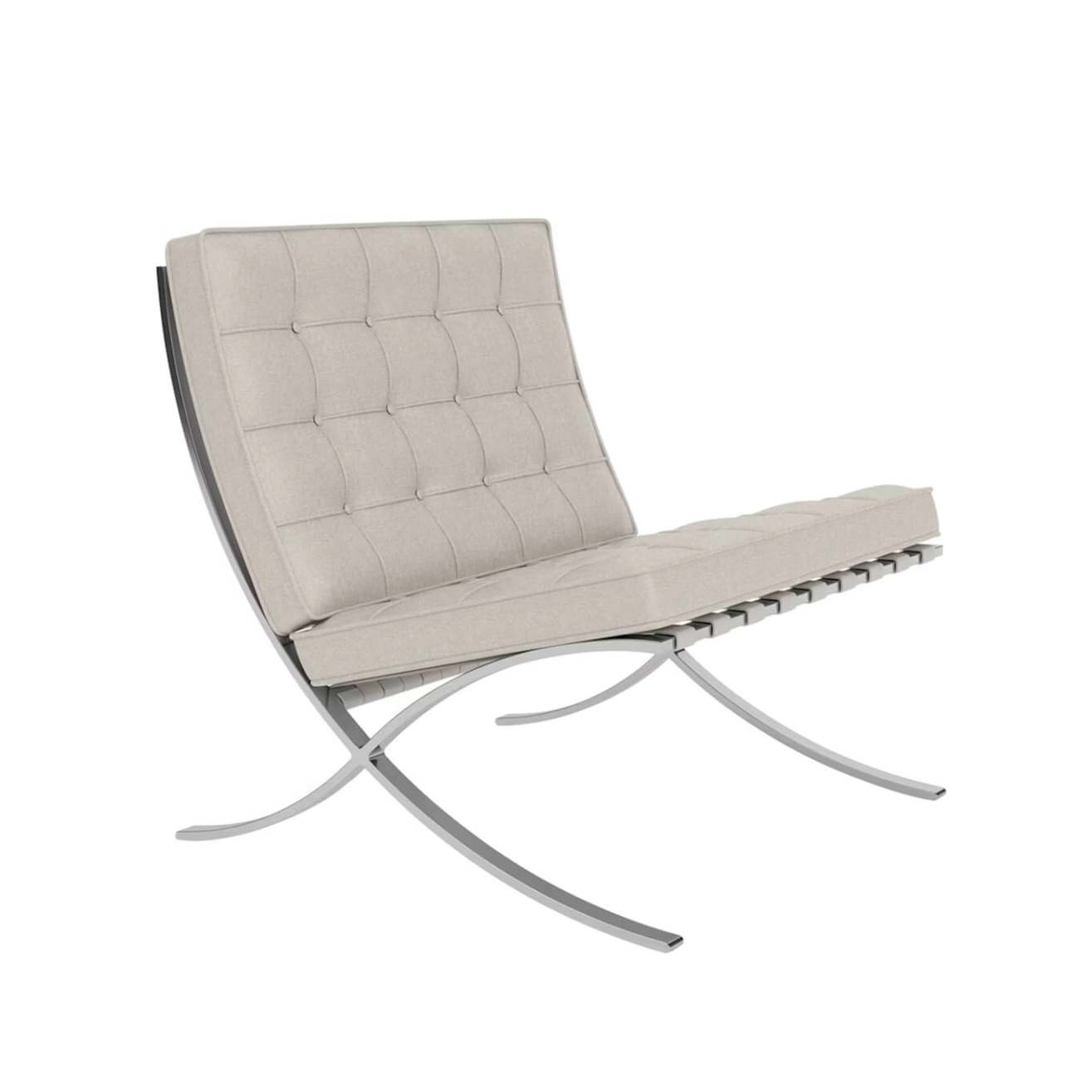 Created by Ludwig Mies van der Rohe for the German Pavilion at the 1929 International Exhibition in Barcelona, the Barcelona Chair has become an icon of modern architecture. Its refined composition reflects the very essence of modernist design. From its elegant crisscross frame to its cushions made of meticulously hand-stitched and assembled squares, each chair is a tribute to the union of contemporary design, high-end craftsmanship, and exceptional attention to detail. Architectural in form, the Barcelona Chair features a canted seat that offers a posture both relaxed and perfectly supported. It is upholstered in Haven fabric, available in four different colors, and features a polished chrome frame. To create the cushions, 40 individual squares of fabric are hand-sewn and tufted with buttons. The cushions are secured to the frame using belting leather straps, with edges dyed to match the upholstery. Each Barcelona Chair is an authentic piece designed by Ludwig Mies van der Rohe. The frame is stamped with the Knoll logo and the designer’s signature, certifying its authenticity and timeless value.