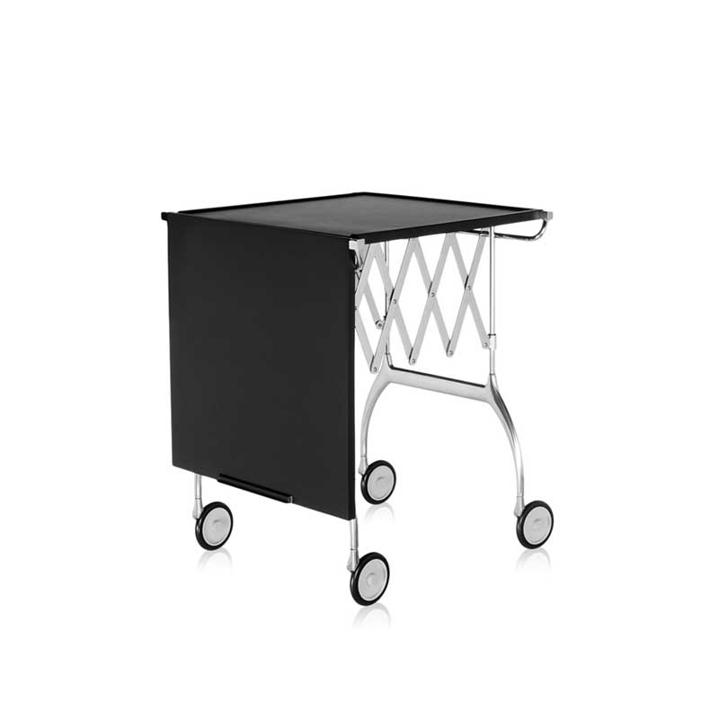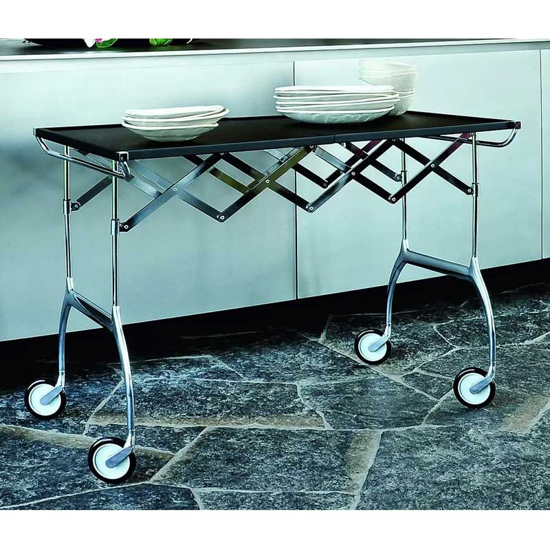 Battista is a practical trolley created by designer Antonio Citterio, featuring a winning combination of plastic and metal. It can be used as a folding extendable table, ideal for buffets and dinner parties, as well as a nest-sized table. It is easy to unfold thanks to a concertina system. When closed, it measures 20cm wide and can be stored anywhere. The Battista rolling table is available in white or black.