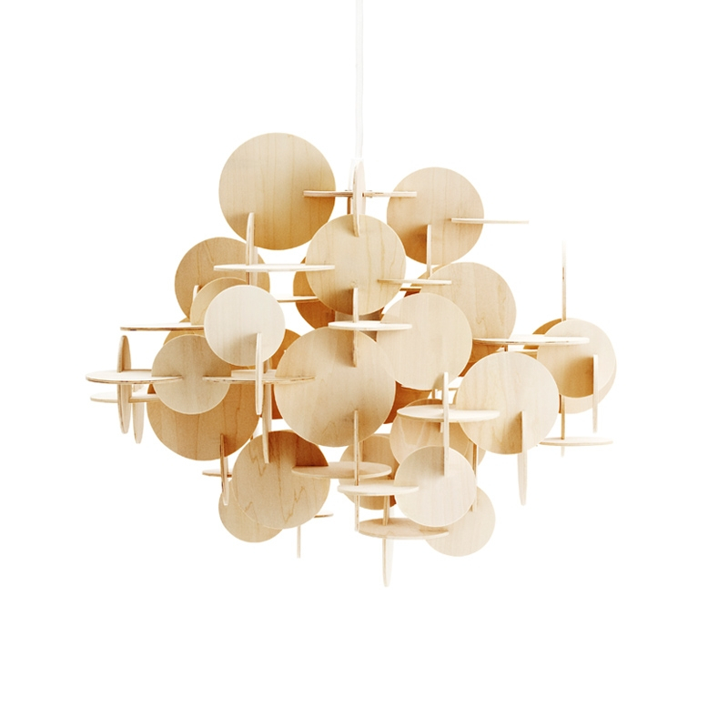 Bau is a sculptural pendant light suspension designed by Danish designer Vibeke Fonnesberg Schmidt for Normann Copenhagen. In a unique and original design that establishes a new way of thinking about light, she has assembled colours and geometric shapes in a tribute to the American sculptor Alexander Calder. Simple pine discs are haphazardly assembled so that the chandelier gradually takes on the shape of a unique sculpture, broken up by the different colours, sizes and irregular assembling of the discs, which give it a lively, natural appearance like a constellation in movement. The Bau lamp, which means 'construction' in German, is an example of a DIY object, because you actually create your own light fitting. The design of the Bau lamp is complex: at first glance, the assembly of the discs seems random, but a closer look at this pendant light reveals that nothing has been left to chance, and the discs create an astonishing optical effect. Perfect to brighten up a child's bedroom in its coloured version or for an entrance hall in its natural version.