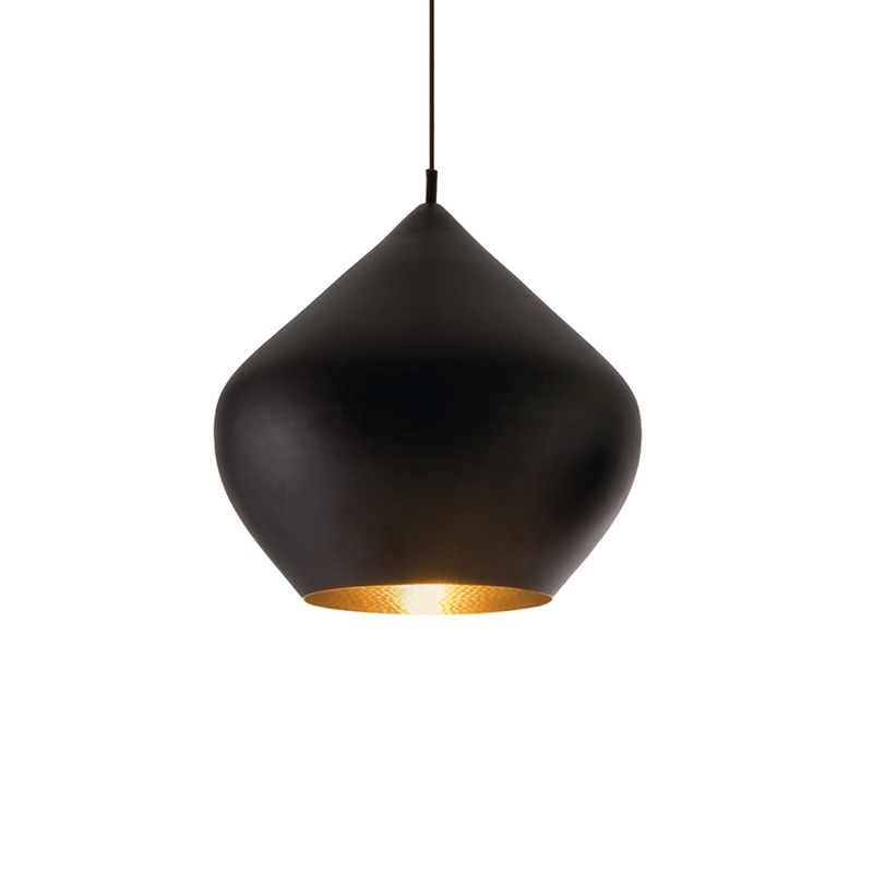 Beat light is a collection of light fittings, designed by Tom Dixon, inspired by the sculptural simplicity of copper pots and traditional Indian vases. The brass parts are hand-hammered using traditional techniques. The outside of the diffuser is smooth contrasting with the reliefs on the inside. The reflective properties of brass allow efficient light diffusion. Available in several colours, the Beat Light collection comes in tall, fat, wide and stout versions that can be combined to create a pendant light feature.