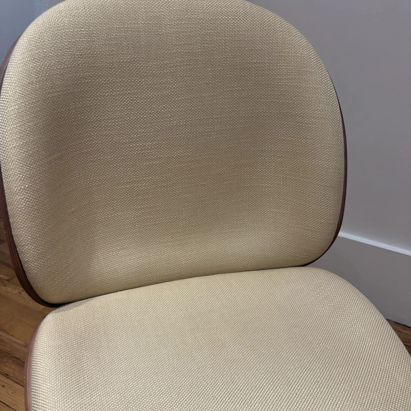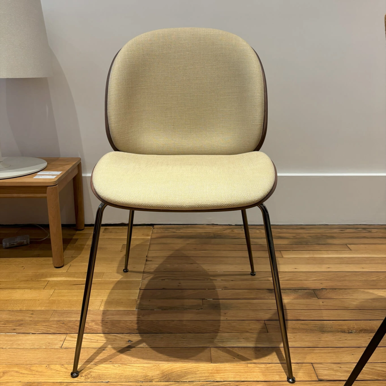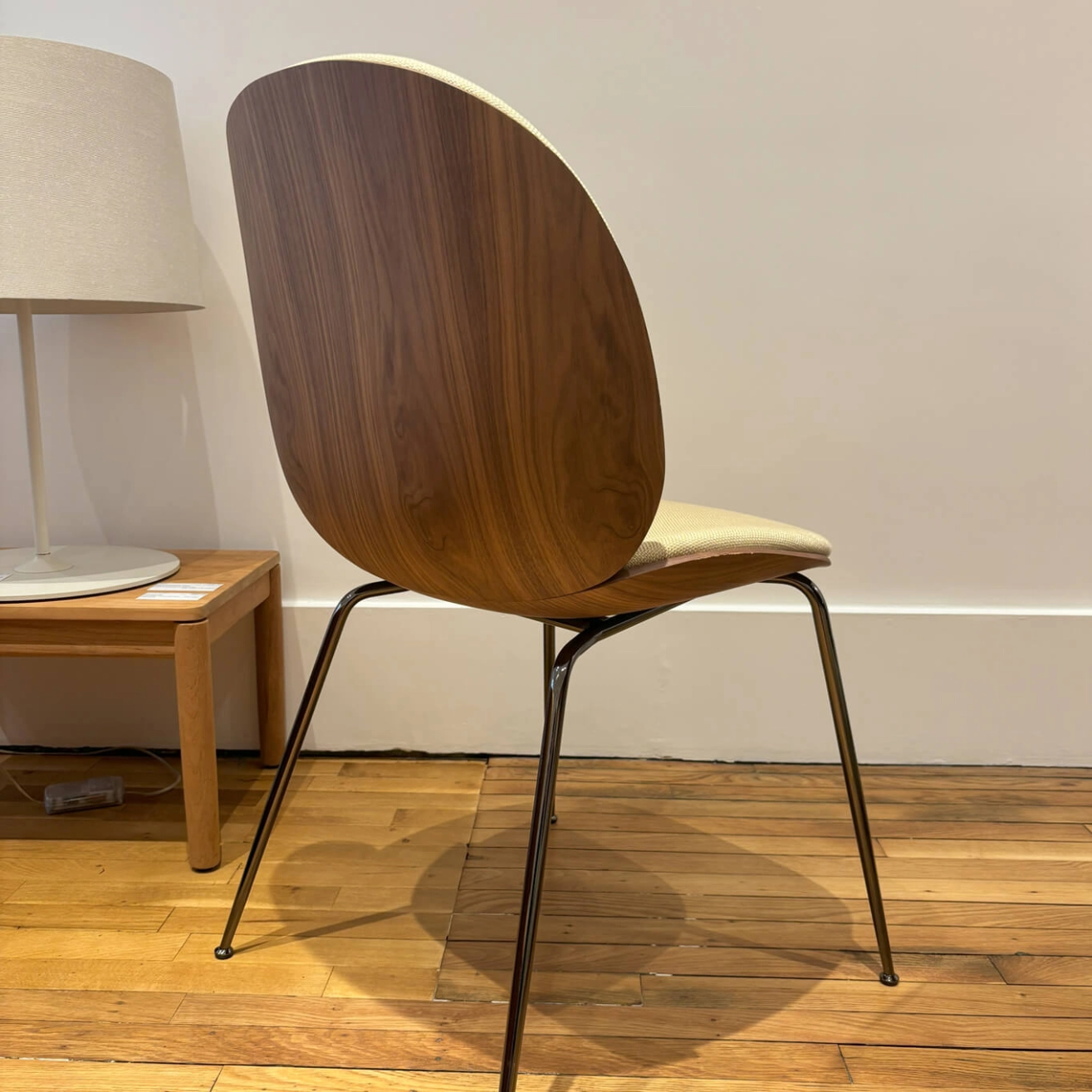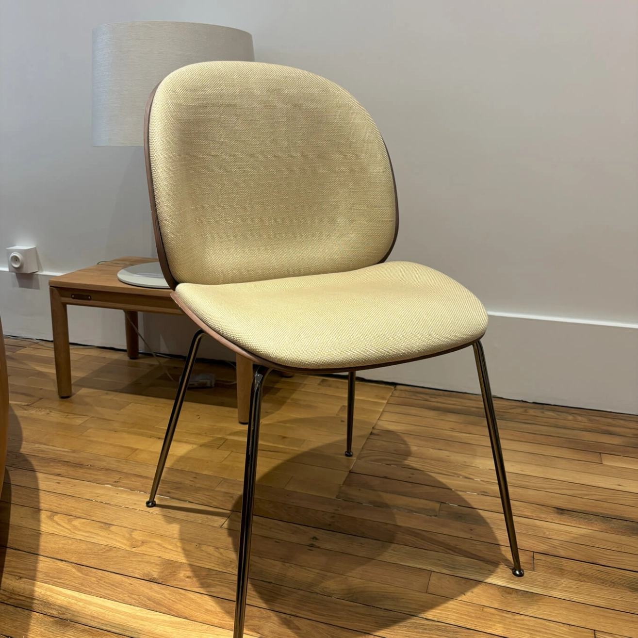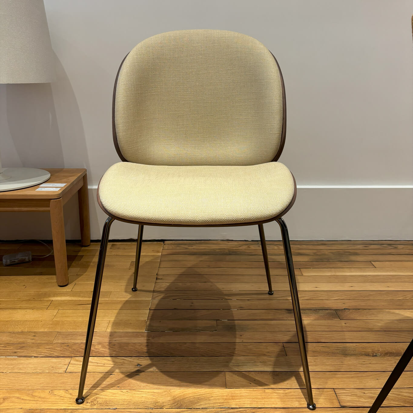 La chaise Beetle, dessinée par le duo de designers GamFratesi pour la marque Gubi, est une véritable icône du design contemporain. Elle se distingue par sa coque enveloppante et son confort exceptionnel. Elle marie subtilement modernité et tradition, combinant des lignes fluides à des matériaux nobles qui en font une pièce intemporelle. Son assise ergonomique et son dossier légèrement incurvé offrent un confort remarquable, idéal aussi bien pour un usage domestique que professionnel. Chaque détail de la Beetle a été pensé avec soin : la finesse du piètement, la qualité du revêtement et la légèreté de la coque contribuent à son allure harmonieuse et équilibrée. Cette chaise s’intègre avec aisance dans de nombreux univers décoratifs, du salon au bureau, en passant par les espaces de restauration. Elle apporte une touche de sophistication discrète et un esprit design affirmé à tout type d’intérieur. À noter toutefois : de petites traces d’usures sont visibles sur le dossier mais sans nuire à son esthétisme ni à sa solidité. Pièce emblématique du mobilier contemporain, la Beetle illustre parfaitement le savoir-faire et l’esprit créatif de Gubi, une marque reconnue pour sa capacité à réinventer les classiques du design avec élégance et audace.