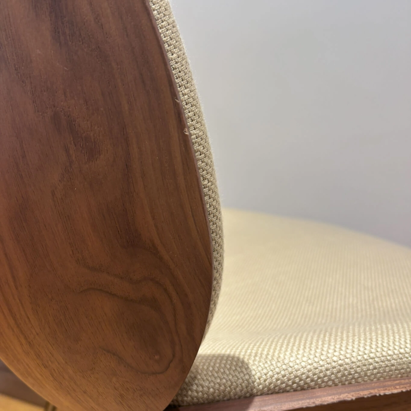 Walnut frame, fabric seat and backrest, black chrome metal base