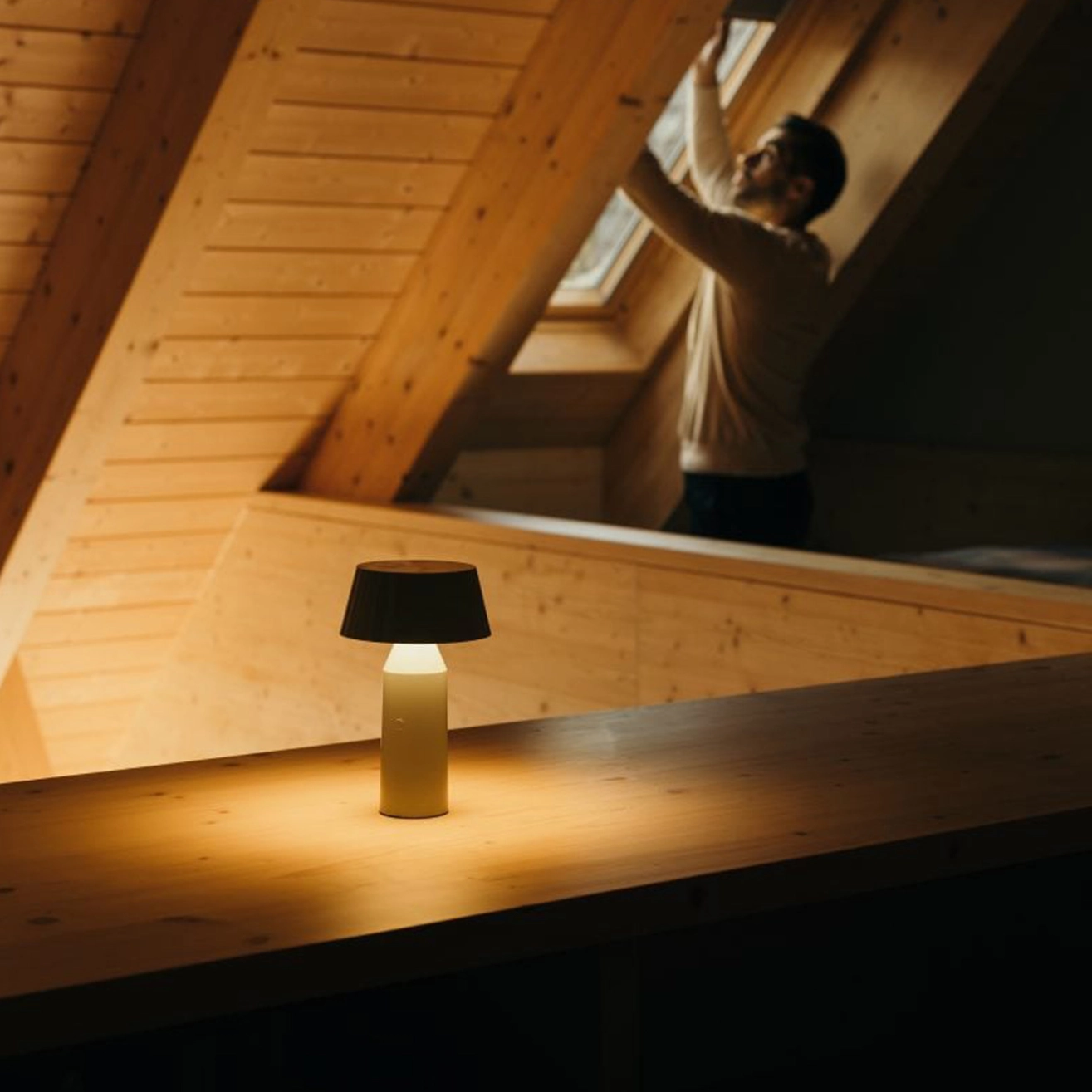 The Bicoca portable lamp portable lamp was designed to brighten everyday moments and bring a gentle, welcoming glow to any setting. Created for Marset, it stands out for its compact silhouette and its joyful use of colour, allowing it to blend effortlessly into a wide variety of personal spaces. Made from polycarbonate, the Bicoca portable lamp is composed of simple geometric shapes that come together to create a lightweight, easy-to-handle object. Its tiltable shade allows you to direct the light precisely, whether placed on a bedside table, a desk, a windowsill or a reading nook. This flexibility gives the lamp great freedom of use, whether at home or on the move. Available in a wide range of colours, the Bicoca portable lamp suits all tastes and interiors. Its compact size and featherweight construction make it easy to carry from one room to another, while its long-lasting battery ensures extended use without limitation. Whether enhancing a cosy atmosphere, lighting up a personal corner or enriching shared moments, the Bicoca naturally finds its place in everyday life.