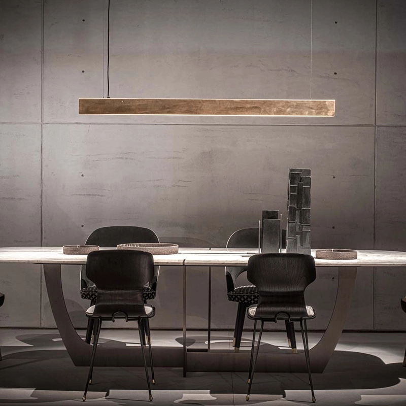 Blade is a collection of lighting created by Baxter. Made from satin brass, the pendant lamp is a unique piece. The structure houses an LED light source that perfectly illuminates a dining table, for example. With its minimalist shape and unique material, Blade works equally well in both contemporary and more traditional interiors.