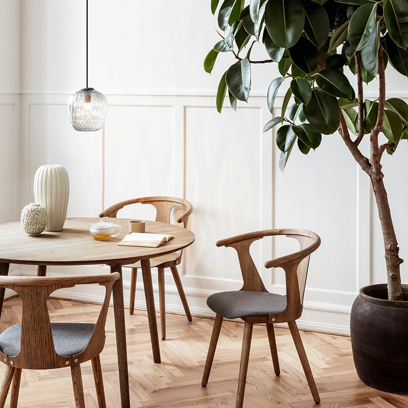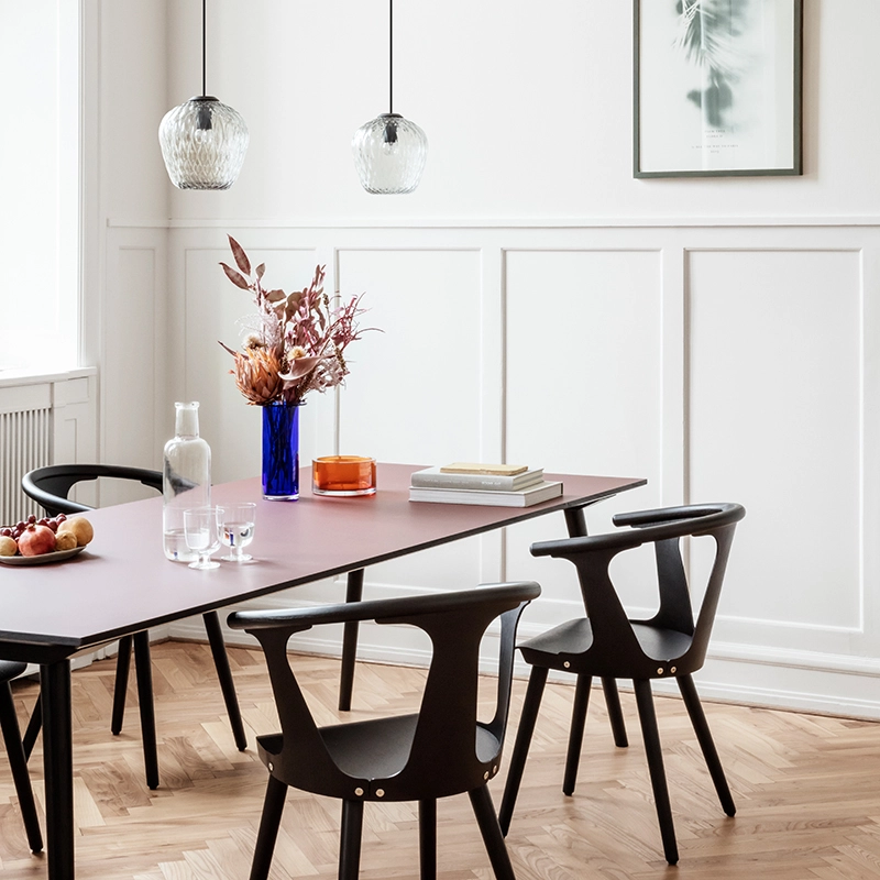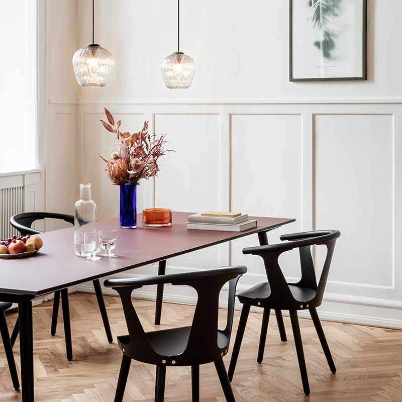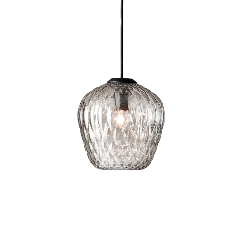 And Tradition combines industrial processes with the craftsmanship of master glassmakers. The texture of the glass is created with computer-aided design to precisely control the size of each bubble. The shape is determined by moulding and then blown by hand. It is a pendant lamp that works well on its own but can also be assembled in clusters, above a dining room table, for example. The sandblasted version gives a subtle and sophisticated light, while the transparent version transforms the space, filling it with its projected patterns.