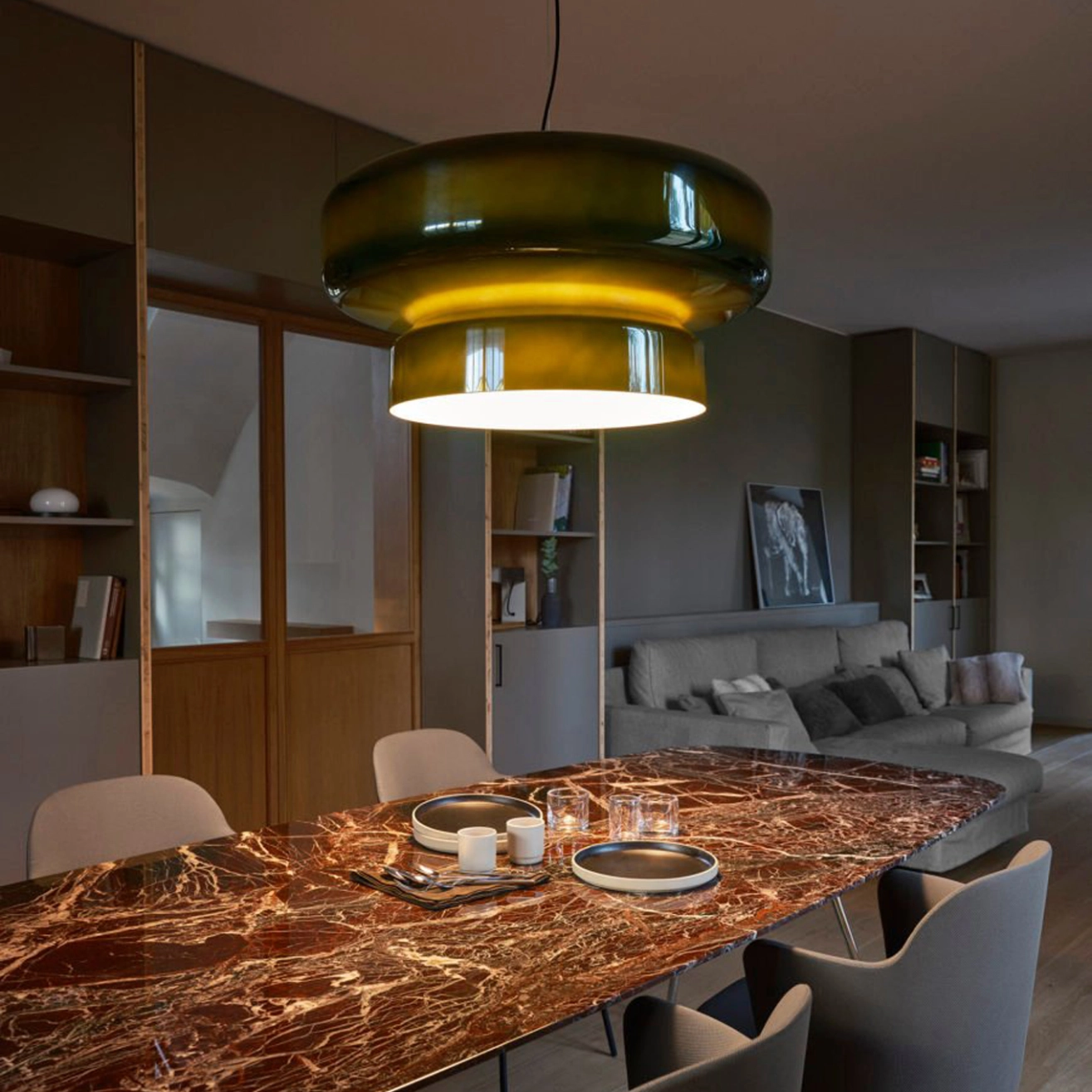 Edited by Marset, Bohemia is a striking and distinctive pendant light distinguished by its remarkable luminosity, which never fails to surprise. At first glance, one might assume it is made of blown glass, yet its scale makes this impossible. Designer Joan Gaspar takes on this material challenge by using polycarbonate instead. The Bohemia pendant features an organic, translucent profile and brings together two volumes within a single form. The result is a large, coloured shade that does not interfere with the white interior, allowing for perfectly controlled illumination. When switched on, the Bohemia pendant casts a crisp white light downwards while also subtly lighting up the shade itself, creating a refined interplay of colour and shadow.