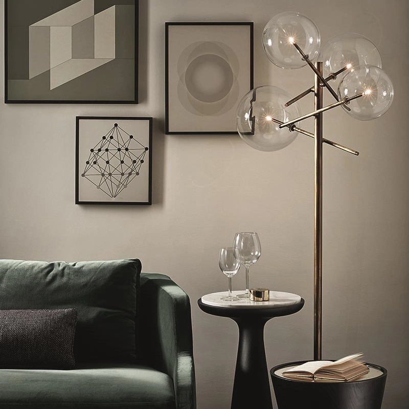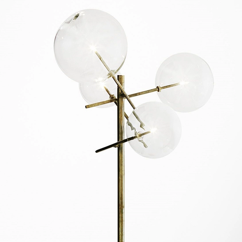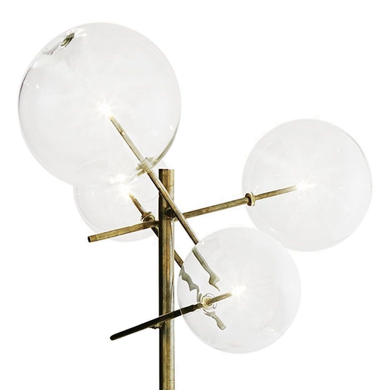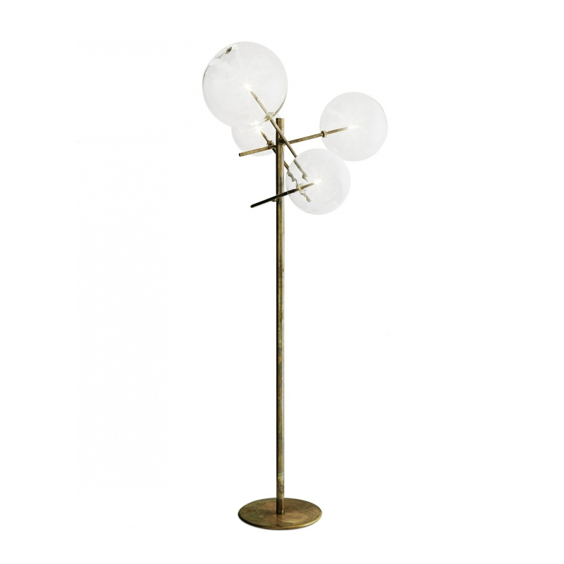 The floor lamp Bolle by Gallotti & Radice is composed of 4 transparent blown glass spheres attached to a hand-burnished brass metal structure.  The finish of the hand-burnished brass structure is naturally mottled and irregular. Thanks to this handcrafted treatment, each Bolle luminaire is unique, making it exceptional. Elegant and poetic, the Bolle collection is also available in a hanging version.