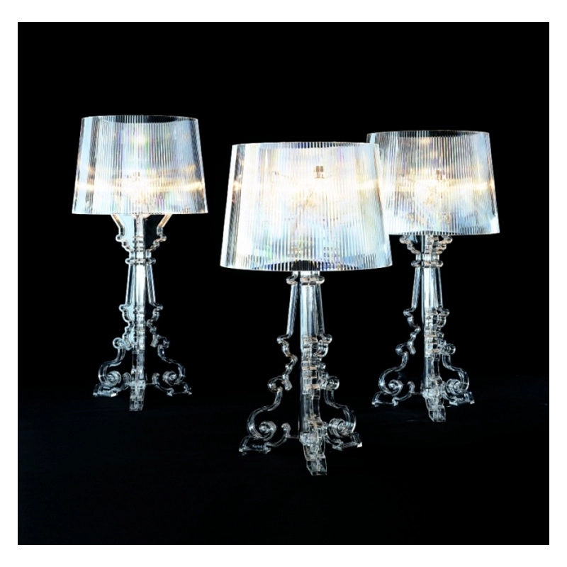 Bourgie, created by Ferruccio Laviani for Kartell, is atable lamp blending tradition and modernity. Its Baroque-style base is made up of three interlocking decorated tiers and its ample lampshade is made with a pleated effect so as to create, when the lampe is lit, an interplay of a thousand reflections. Three different heights are possible (68cm, 73cm, 78 cm) thanks to the special hanging system built into the lampshade. Anyone can choose to mount the Bourgie lamp at the height they prefer and then modify it as they see fit, depending on how they want to use it. Bourgie is adesign icon from the Kartell luminaire collection and is available in silver, crystal or black finish.