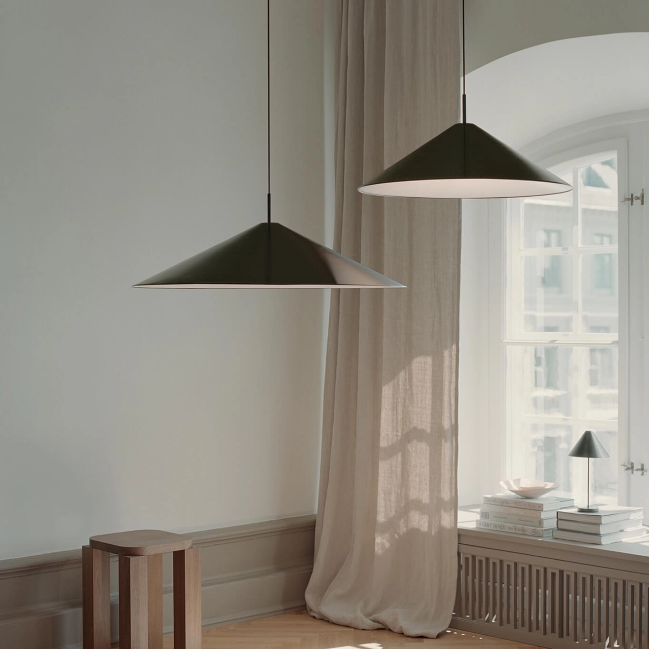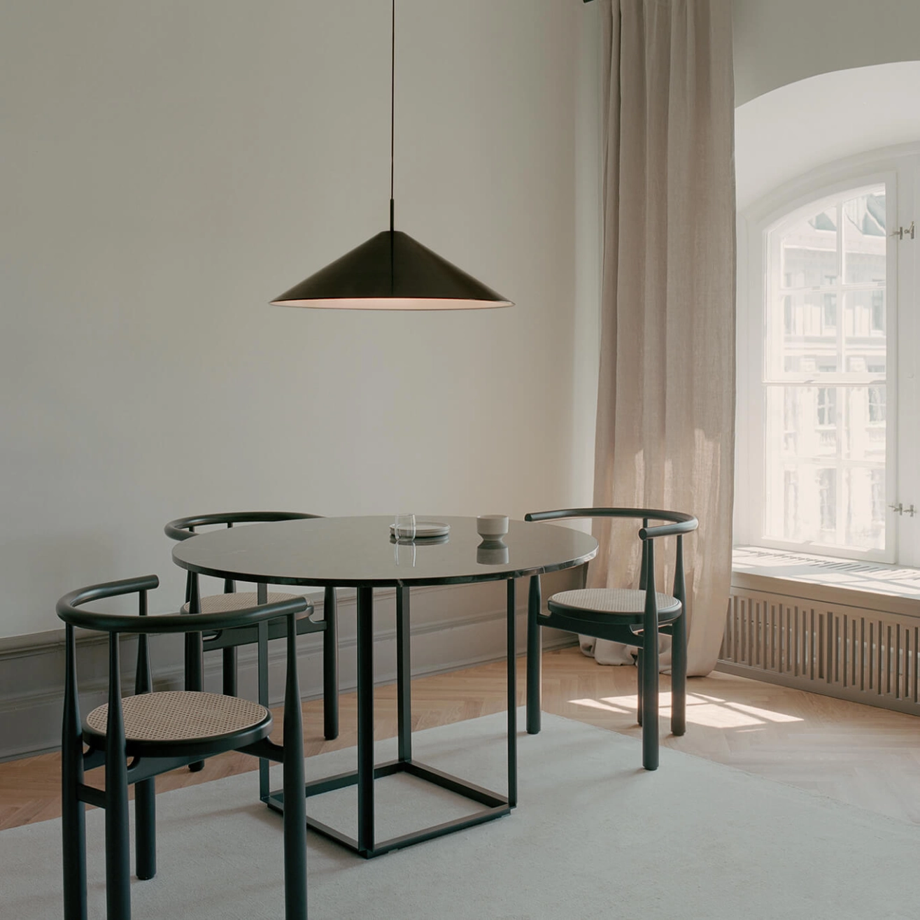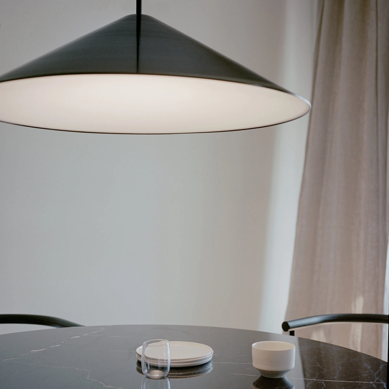 The Brolly lighting collection highlights the power of classic simplicity. Precise and thoughtful in their design, the lamps embody a refined, almost deceptive simplicity, capable of becoming a timeless element in any environment. The Brolly pendant lamp is available in two sizes, and its volume is designed to fit perfectly into contemporary architectural designs. The flared diffuser creates a concave effect on the underside of the lamp. Place the pendant lamp above the dining table or wherever you want to enjoy soft light and a striking silhouette.