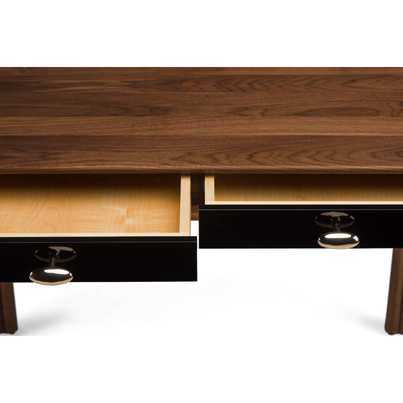 The Elliot desk by Jason Miller for De La Espada was inspired by the juxtaposition of old and new design seen in Brooklyn's converted neighbourhoods: modern with historical references. A wooden frame surrounds two painted hdf drawers with bronze handles, dovetailed joinery and a smooth closing mechanism. Elliot is part of a family of furniture that includes a dining table and a chair.