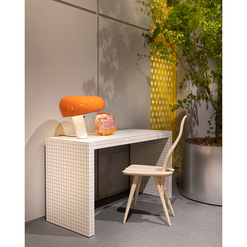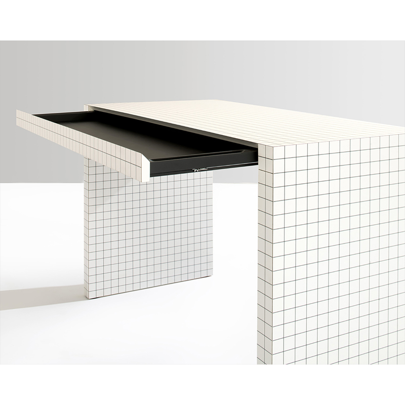 The products in the Quaderna collection are the result of a highly industrialised process and at the same time great craftsmanship. The tile laminate has been specially created based on Superstudio's design and features a 3 cm grid, produced using digital printing. This laminate is then applied by hand, requiring great precision and several hours of work for each piece. The convergence of the lines in the pattern creates a homogeneous surface, giving the furniture a strong personality.