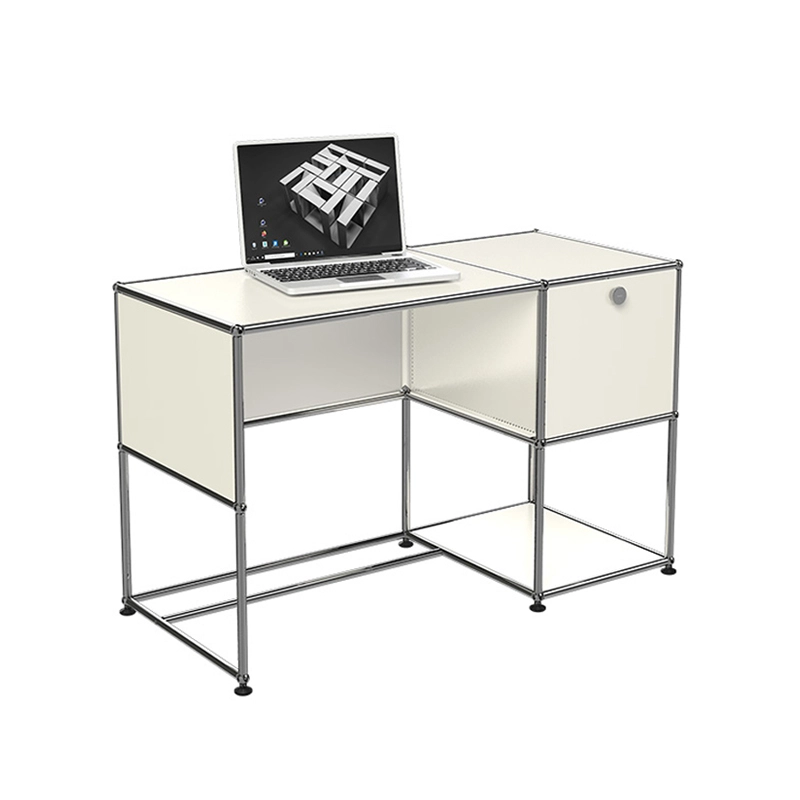 The Haller B21 home office desk is fitted with a hinged door module. It has a chrome-plated steel frame assembled by connecting balls, clad in powder-coated steel panels and mounted on height-adjustable glides.  Classic doors requiring no keys. (Secured on delivery, the door unlocks for the first time using a coin or a normal key)
