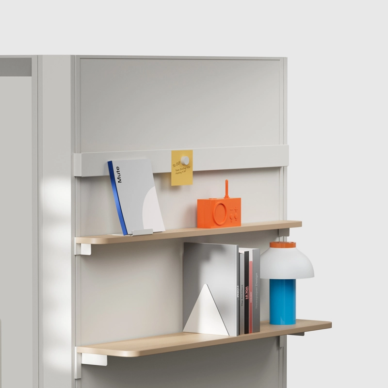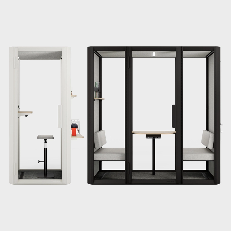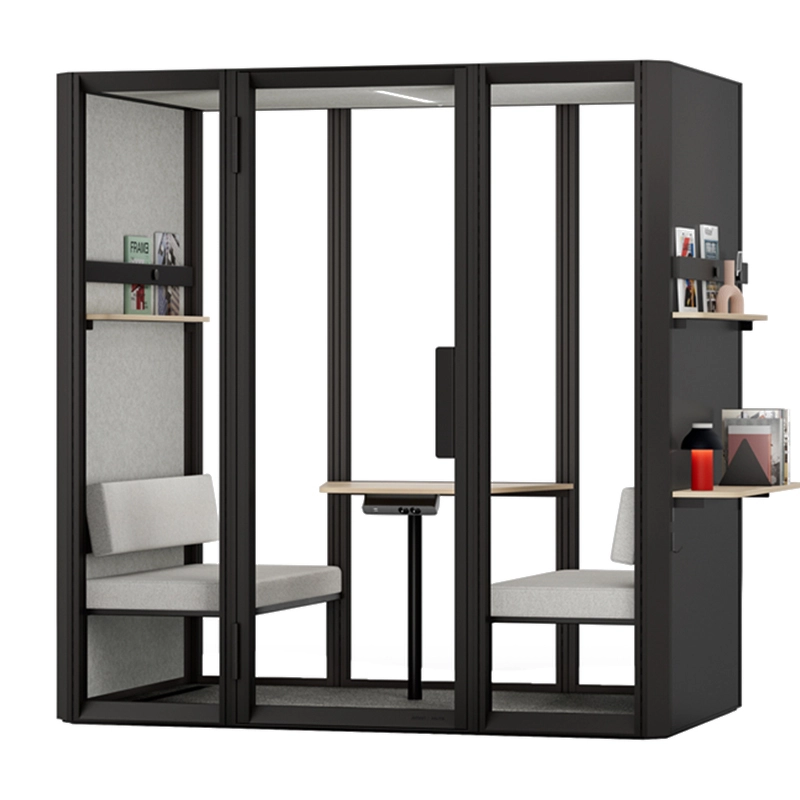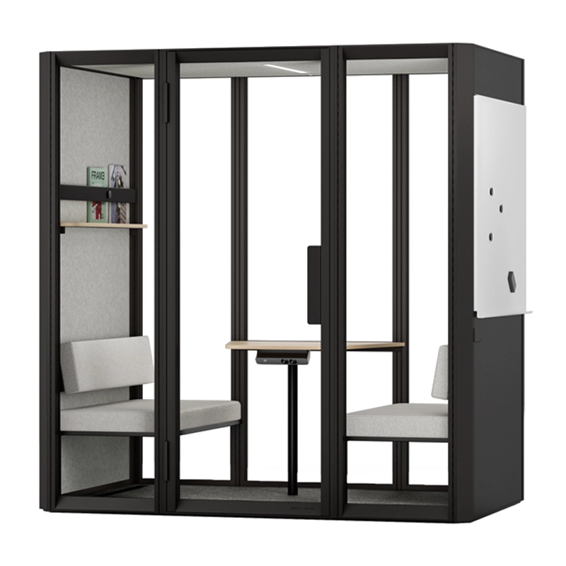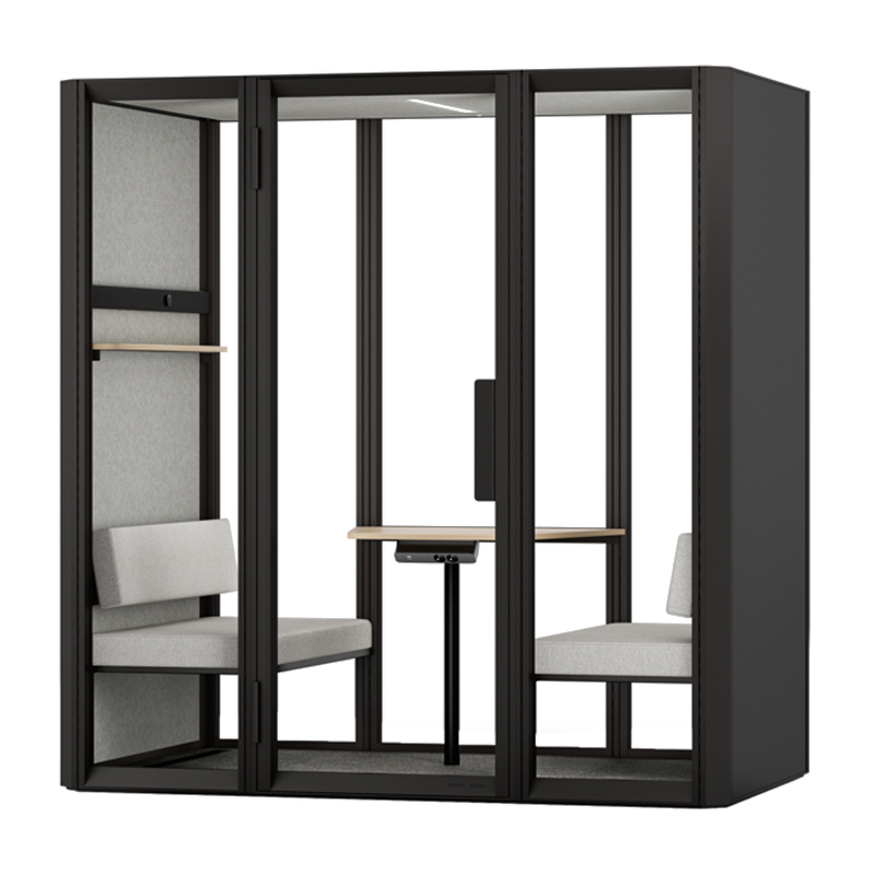 The Jetson L4 acoustic cab is designed to accommodate up to 4 people. It has two sofas with height-adjustable backrests, a melamine table, a narrow shelf with a display rail and magnet, and a wall hook.