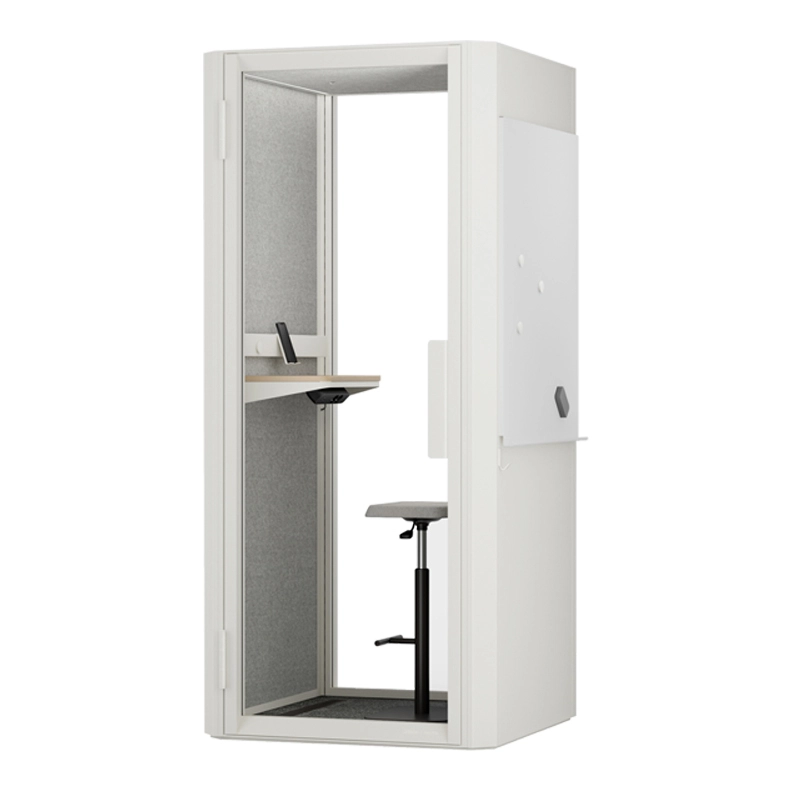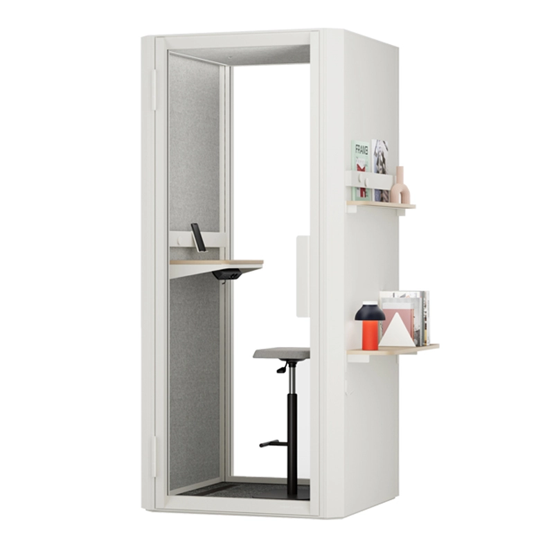 The Jetson S1 acoustic booth is equipped with a wall-mounted shelf and a height-adjustable stool. Optional accessories are available: - A set of elegant shelves, including a deep shelf, a narrow shelf, a display rail, a wall hook and a display stand. - A whiteboard, supplied with a marker pen, a sponge, 3 magnets and a wall hook