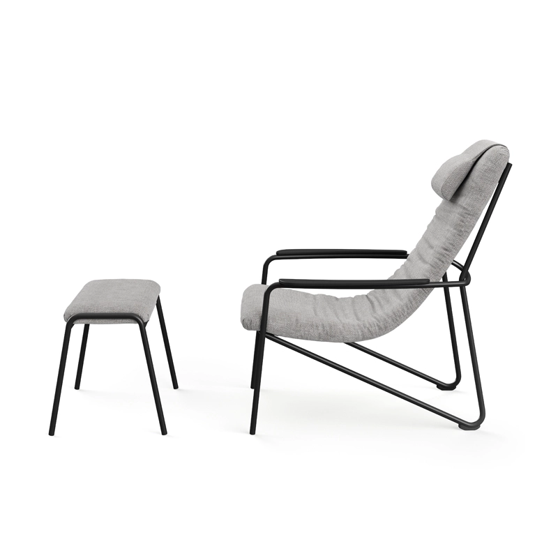 Structure acier inoxydable finition époxy, accoudoirs HPL outdoor, assise HPL, mousse et tissu outdoor